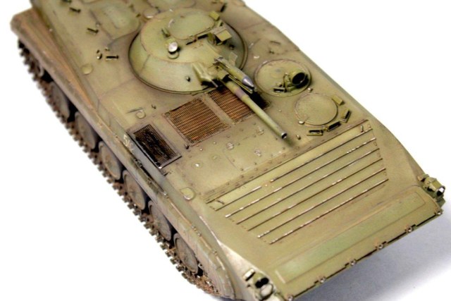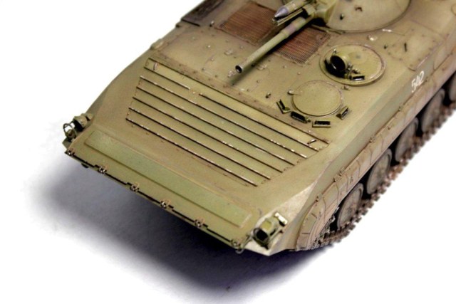 Симпатичная получилась модель. Конечно такая вещь, как БМП-1, без триплексов, смотрится не очень. Ибо их там много, куда не посмотри. Матчасть обсуждать смысла нет, ибо модель позиционируется как искоробочная. А вот художественная составляющая, смотрится очень хорошо. Ржа, на решетках двигателя, не понравилась. Есть не мало мест, которые проржавеют гораздо раньше, чем решетки. Но они такими не выглядят. Но! именно как художественный прием, это смотрится. Картину дополняет весьма удачно.