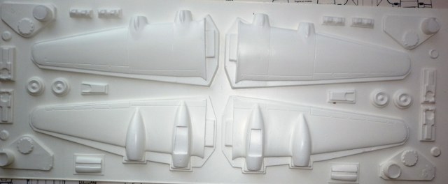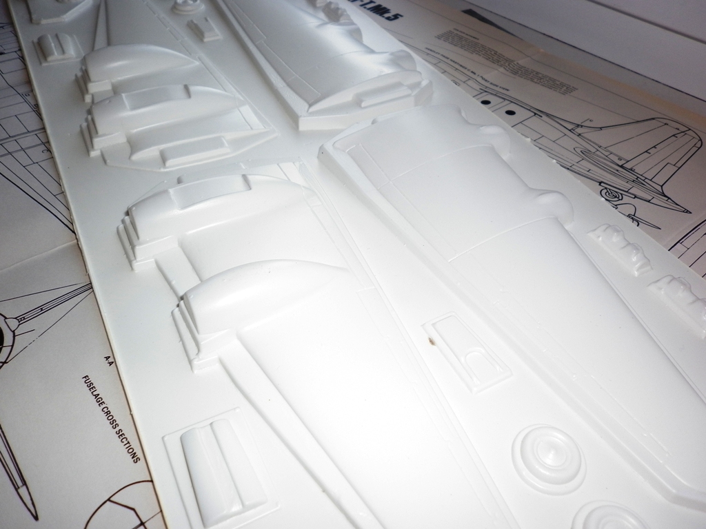 Пластик около 0.8 мм мягкий . Поверхность деталей чистая. Штамповка довольно чёткая. Детали с максимальным к-том вытяжки истончены до состояния бумаги и деформированы. Впрочем , всё это легко лечится эпоксилином.