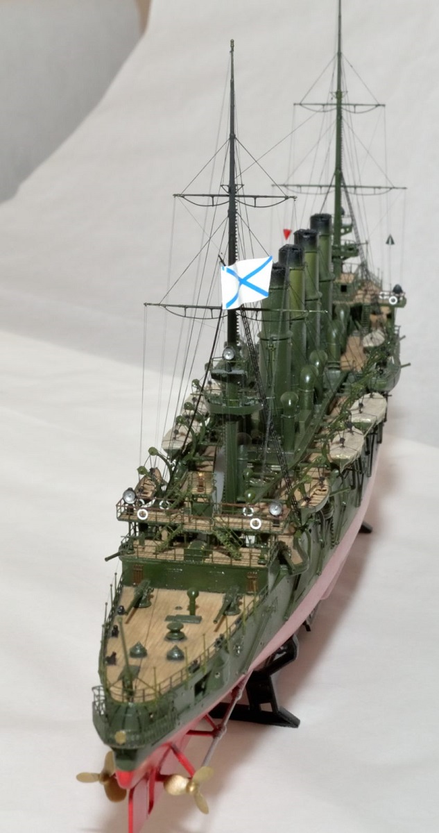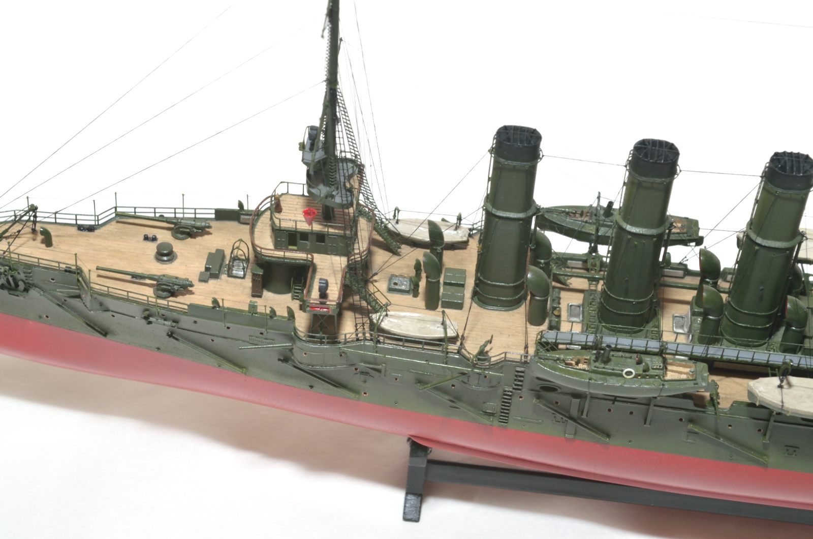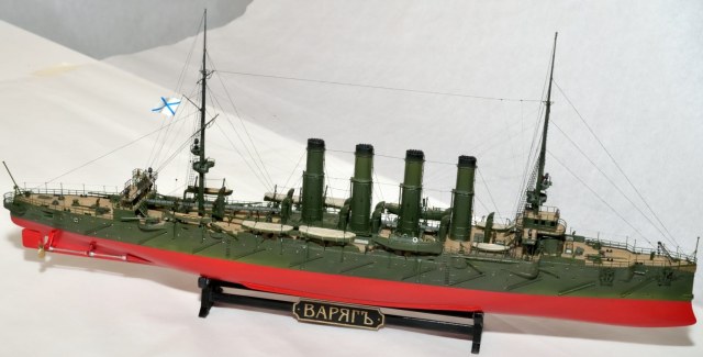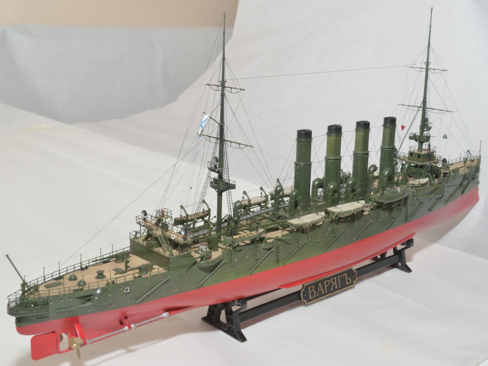 Модель самого знаменитого крейсера русского императорского флота в масштабе 1/350, построенная на конец октября 1903 г. Как оказалось, это не только самый знаменитый русский корабль, но и самый спорный и загадочный! Сколько различных версий о его подвиге было выдвинуто, сколько копий сломано в баталиях наших современников да и не только об итогах того героического боя, а долгая и полная неожиданных поворотов жизнь данного корабля только добавляла ему все новые истории и даже легенды.