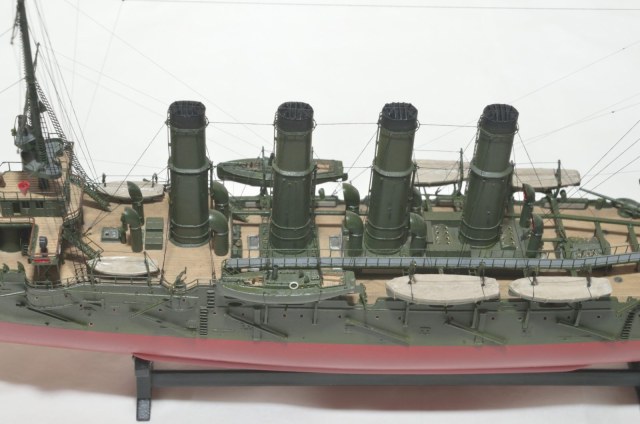 Артиллерия вся от Комплект ЗИП, 6" использованы станки, а стволы точеные, так же и 3" - станки смоляные, а стволы точеные. 47-мм комбинированные, часть казенника родной пластик, стволы точеные, те, что на тумбах на полубаке тумбы от 47-мм орудий опять же Комплект ЗИП.