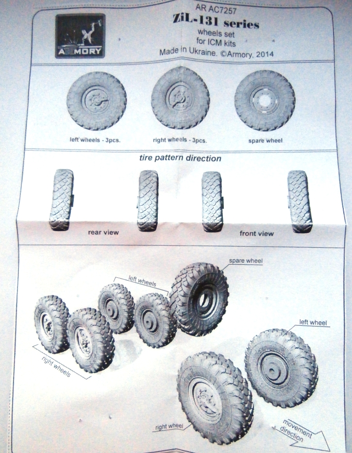 Наконец - то дождался я этого набора. Анонсирован он был еще осенью прошлого года, а добрался до меня только месяц назад. Набор смоляных колес для ЗиЛ-131 в 72-ом масштабе, производства украинской фирмы "Армори" . В комплекте 7 смоляных колес, три правого вращения, три - левого и одно запасное. Качество литья вполне приличное, можно даже попытаться прочитать надписи на боковине покрышек. Обнаружил пару маленьких "пузырей", но они правда не глобальные. В наборе присутствует инструкция с подсказками по установке колес на модель.