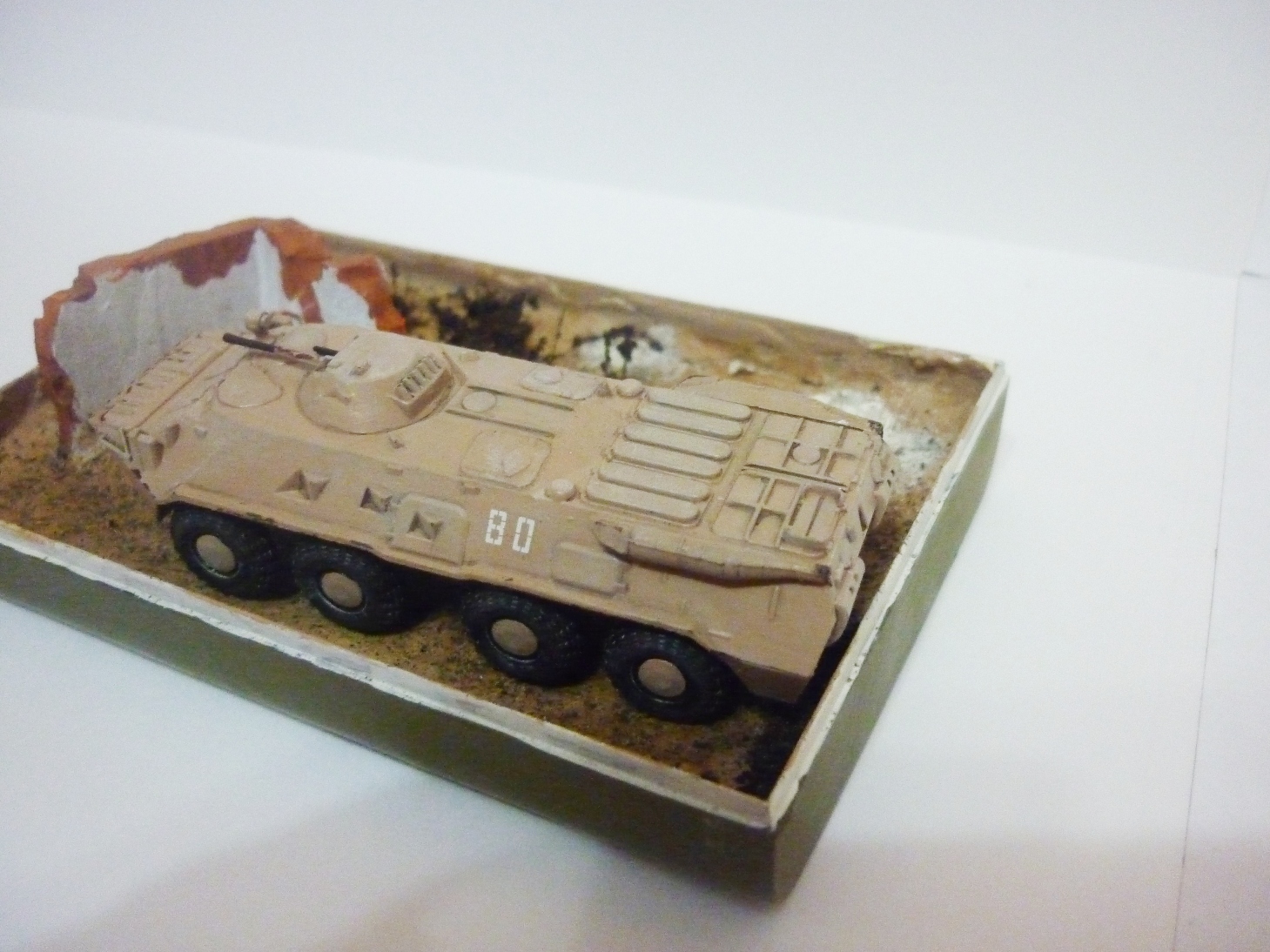По модели - БТР 80 от звезды в масштабе 1\100. Смывка, сухая кисть по граням, сколы. Немного пастели на колесах в качестве запыления. На вопрос "почему он не зеленый " отвечу - не было краски).
