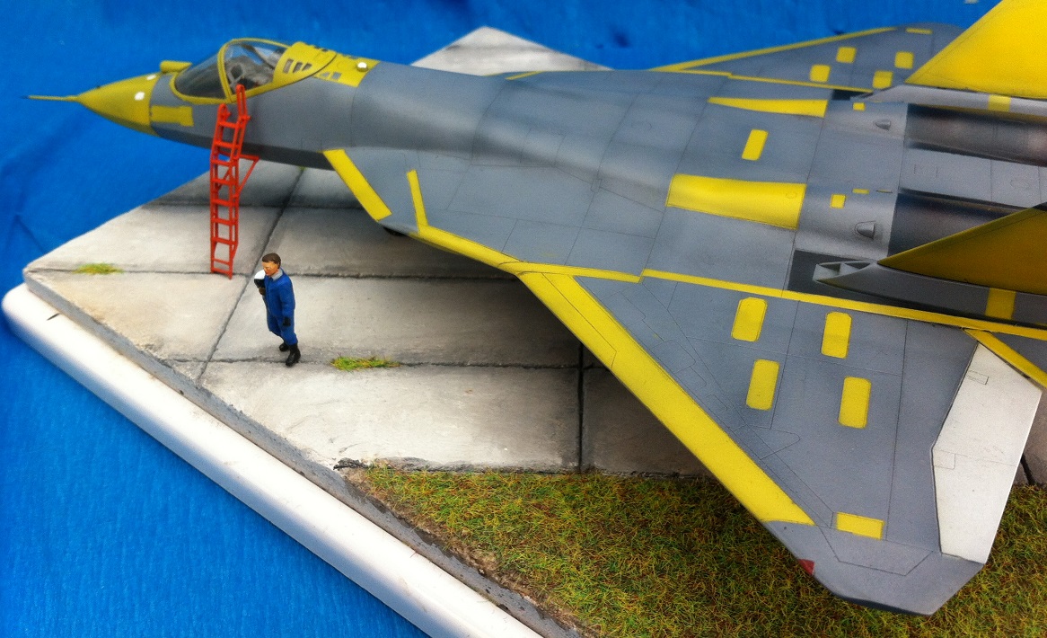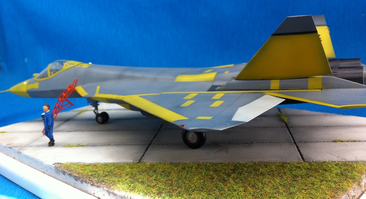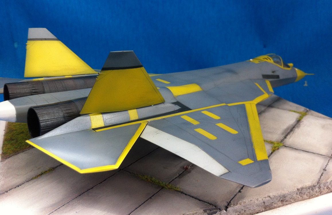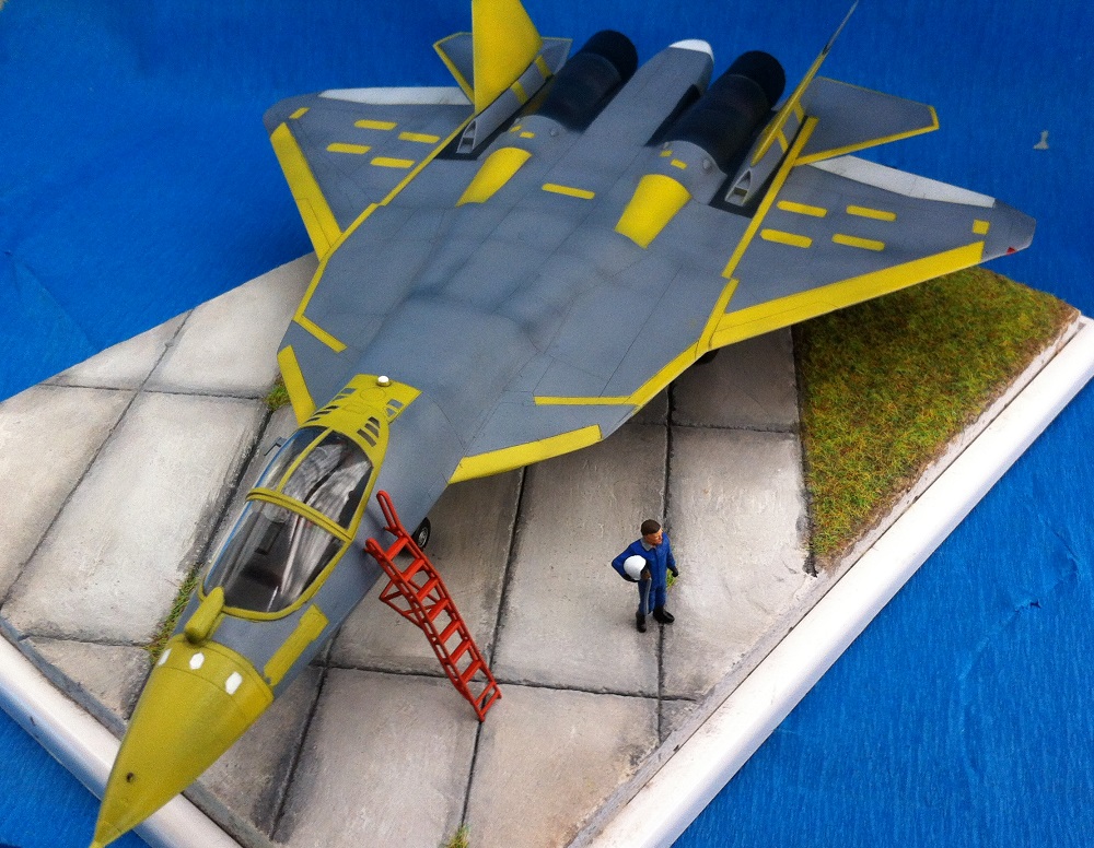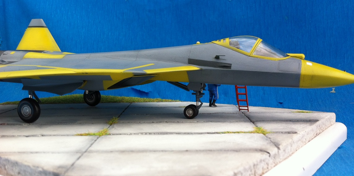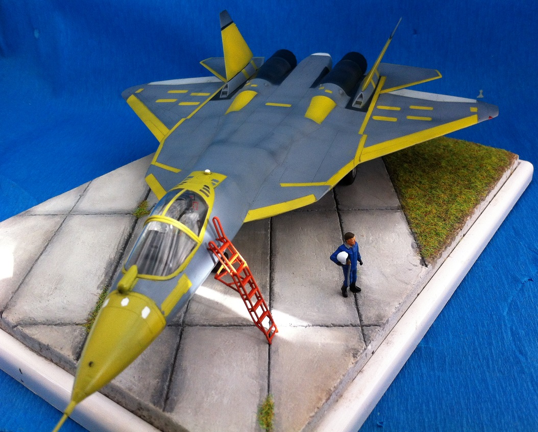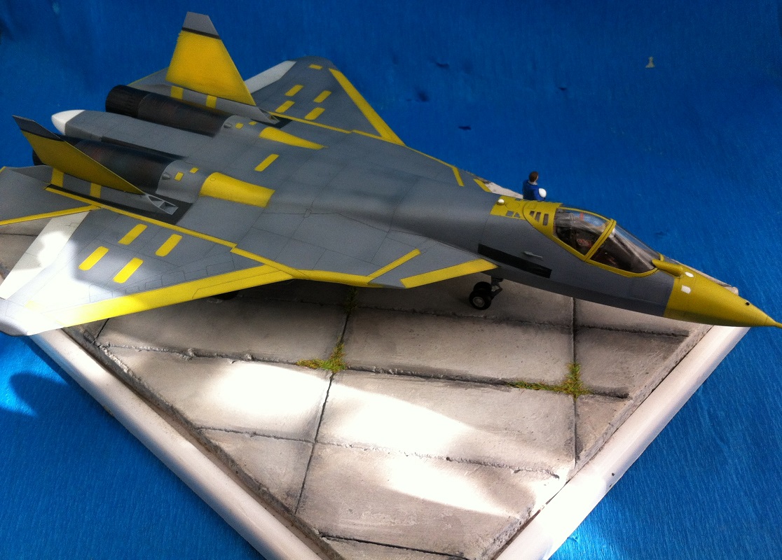 Кит от Звезды. Собираемость - средняя , отливки планера были изогнуты "винтом" , из-за этого одно крыло направленно вверх , а второе- вниз , пришлось разогревать пластмассу в кипятке и править , так же была изогнута левая ПЧК - в "0" этот прогиб вывести не получилось. В общем "Звезде" за такой откровенный брак - предупреждение! )) Обильному шпаклеванию подверглись воздухозаборники - собираются они из нескольких деталей просто отвратительно. Окраску взял с первых полётов прототипа , тем более , что подвижная часть фонаря и намекает , что это - 51 борт. Накладывание масок для покраски заняло 2 вечера - оооочень медитативное занятие , не для слабонервных ,больше я на такое не подпишусь. Окраска - акрил "Мастер" от "Звезды" - просто замечательная краска , очень "укрывистая". "Пачкать " сильно не стал - только выделил расшивку серым пигментом "Акан". То , что первый полёт Т-50 совершил зимой я знаю , но зимней ВПП у меня в загашники не было )))