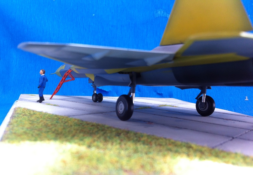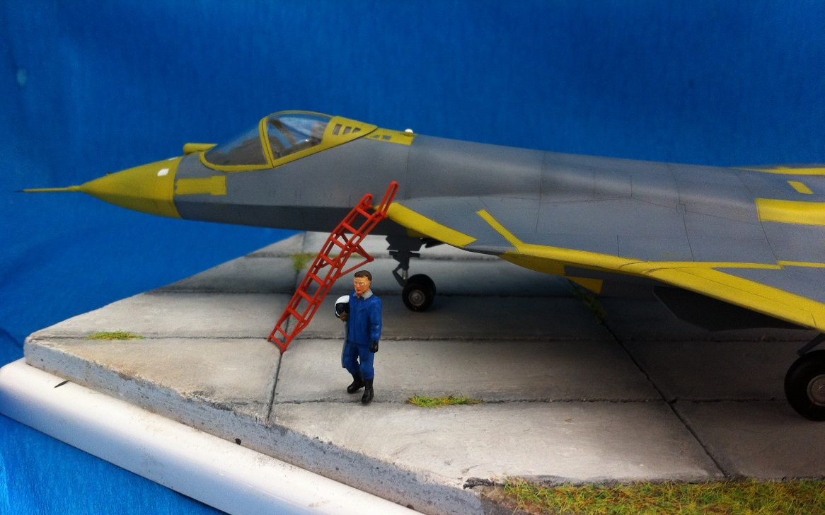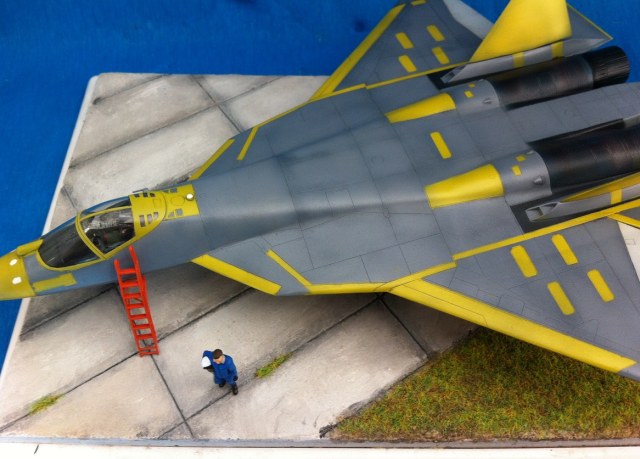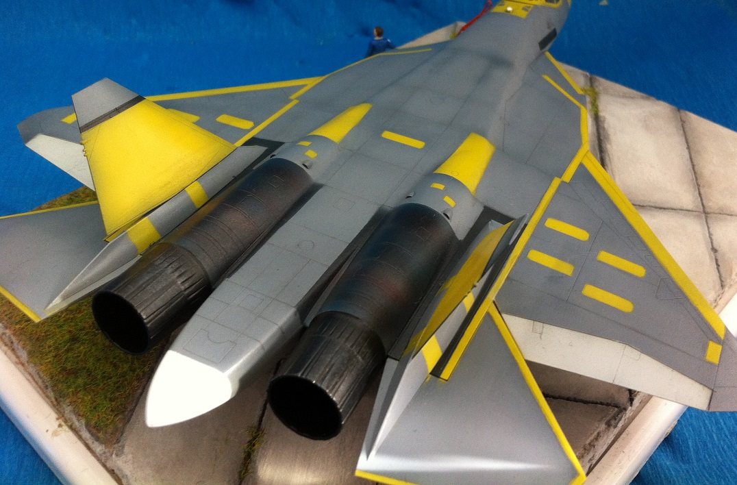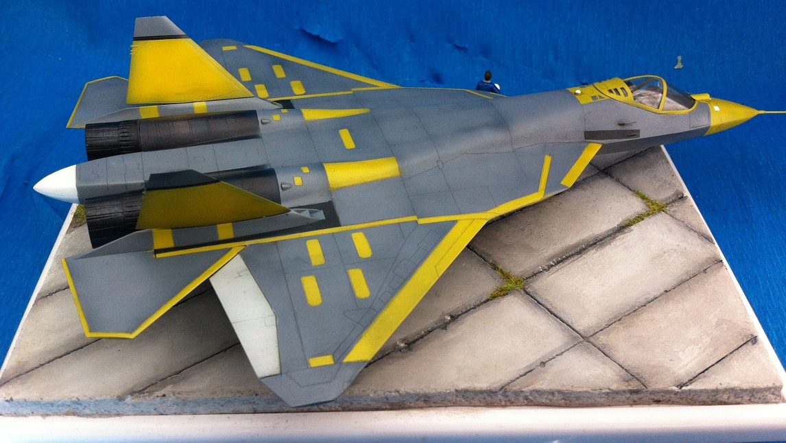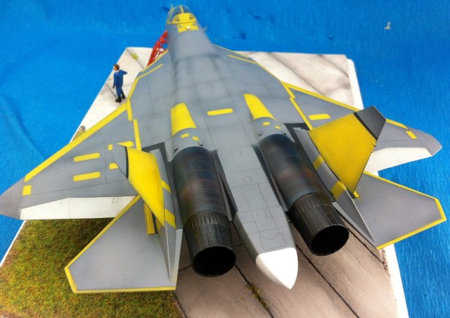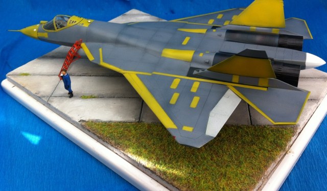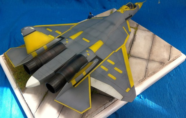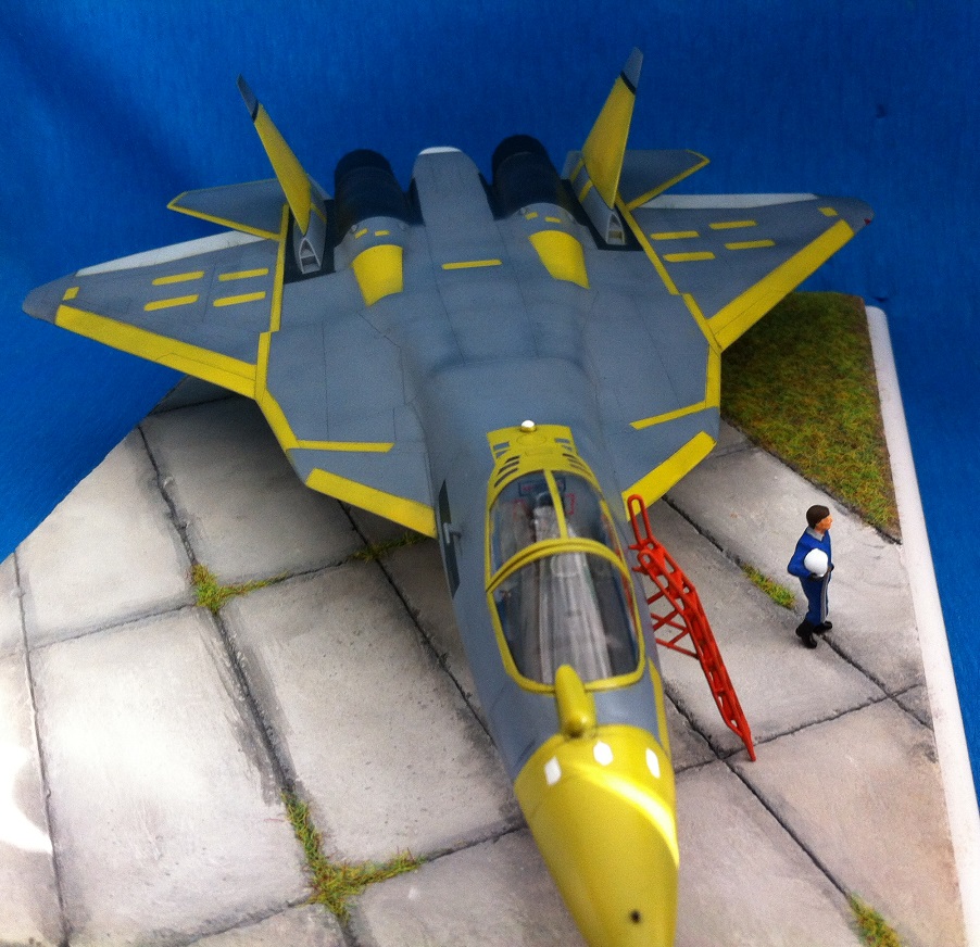 Кит от Звезды. Собираемость - средняя , отливки планера были изогнуты "винтом" , из-за этого одно крыло направленно вверх , а второе- вниз , пришлось разогревать пластмассу в кипятке и править , так же была изогнута левая ПЧК - в "0" этот прогиб вывести не получилось. В общем "Звезде" за такой откровенный брак - предупреждение! )) Обильному шпаклеванию подверглись воздухозаборники - собираются они из нескольких деталей просто отвратительно. Окраску взял с первых полётов прототипа , тем более , что подвижная часть фонаря и намекает , что это - 51 борт. Накладывание масок для покраски заняло 2 вечера - оооочень медитативное занятие , не для слабонервных ,больше я на такое не подпишусь. Окраска - акрил "Мастер" от "Звезды" - просто замечательная краска , очень "укрывистая". "Пачкать " сильно не стал - только выделил расшивку серым пигментом "Акан". То , что первый полёт Т-50 совершил зимой я знаю , но зимней ВПП у меня в загашники не было )))