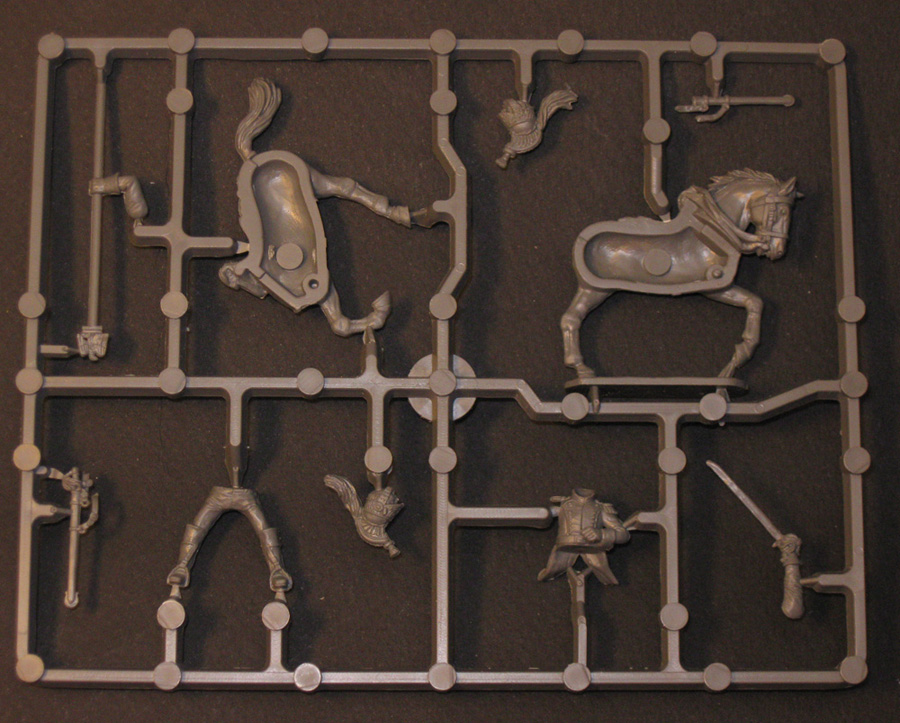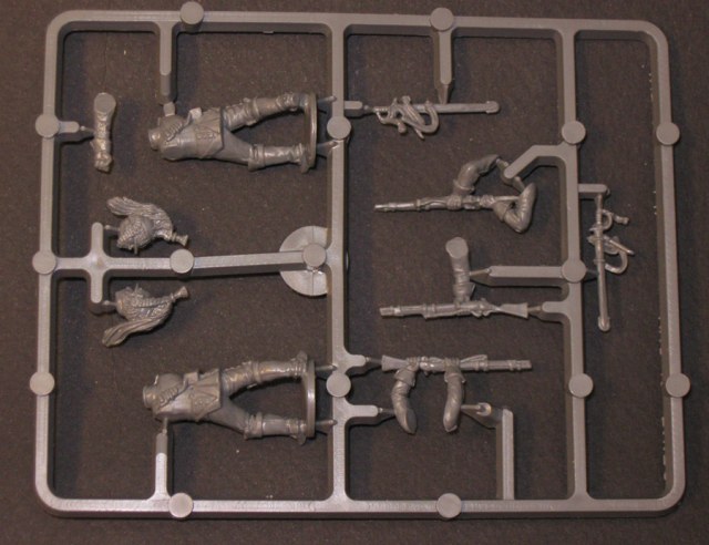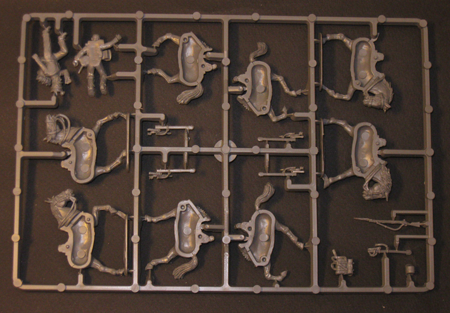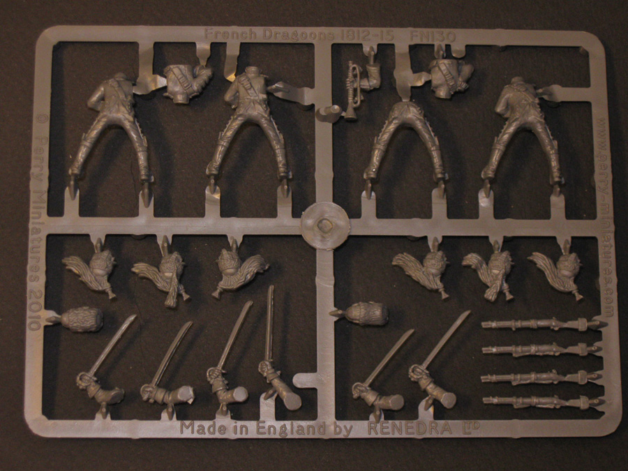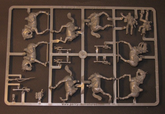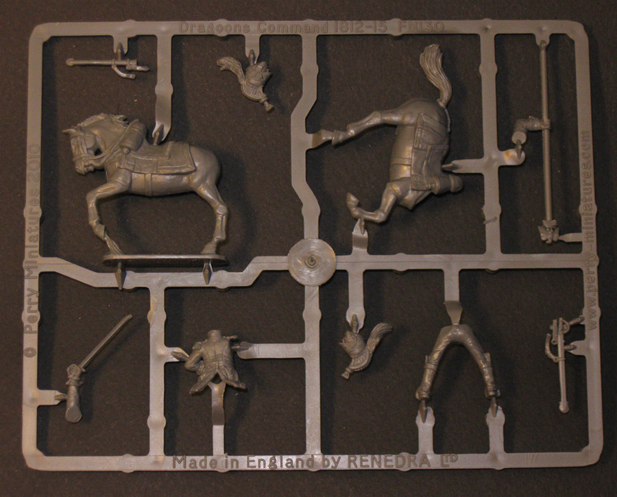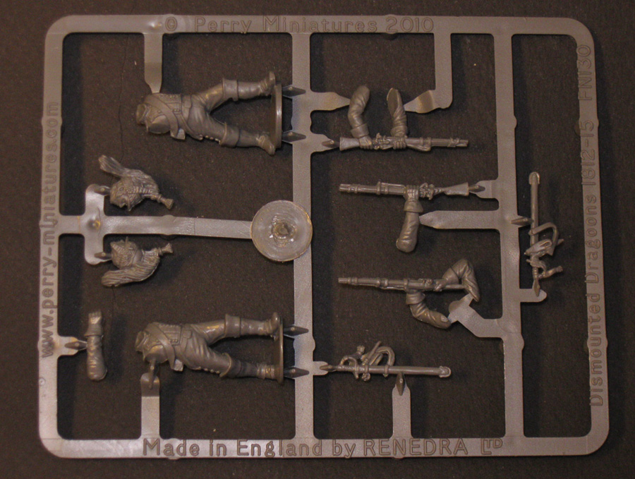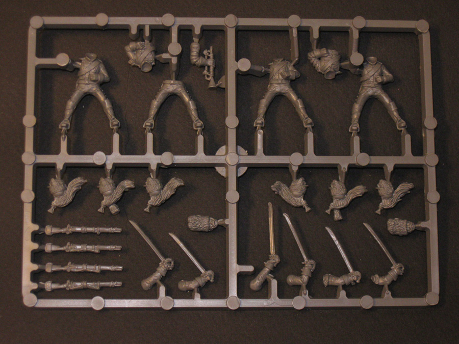 От PerryMiniatures. Пластик а здесь именно пластик, очень и очень приятный в обработке. Очень хорошее качество отливок, перекосов и смещений форм практически нет. В коробке одиннадцать литников с фигурками и один литник с подставками, ещё есть информационный лист (двухсторонний).