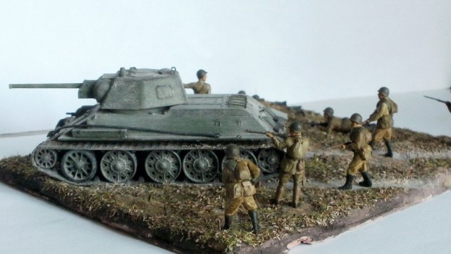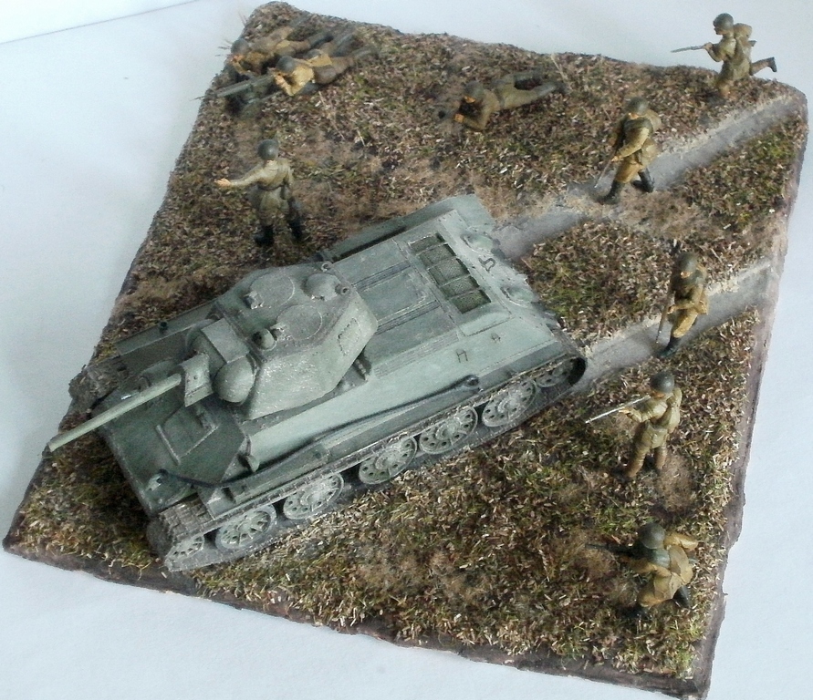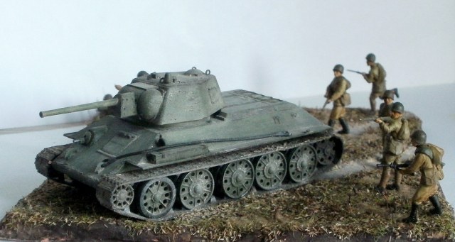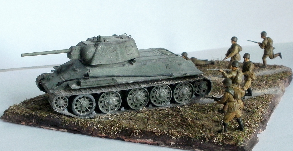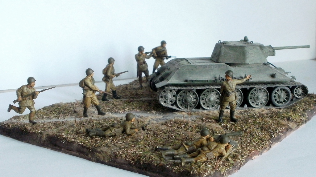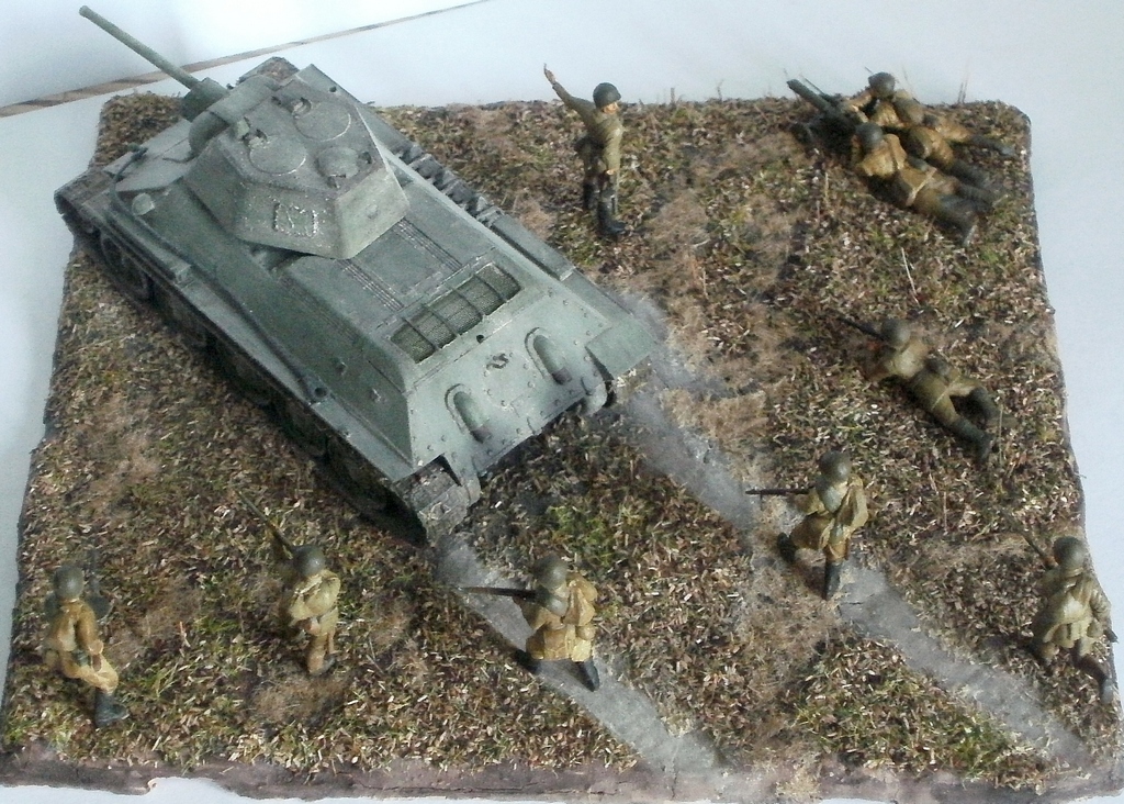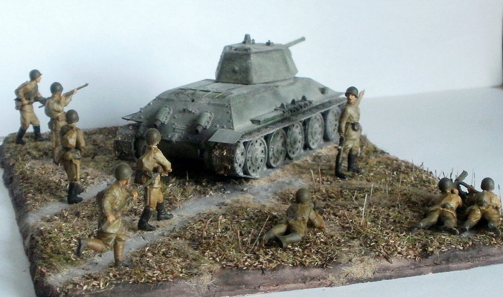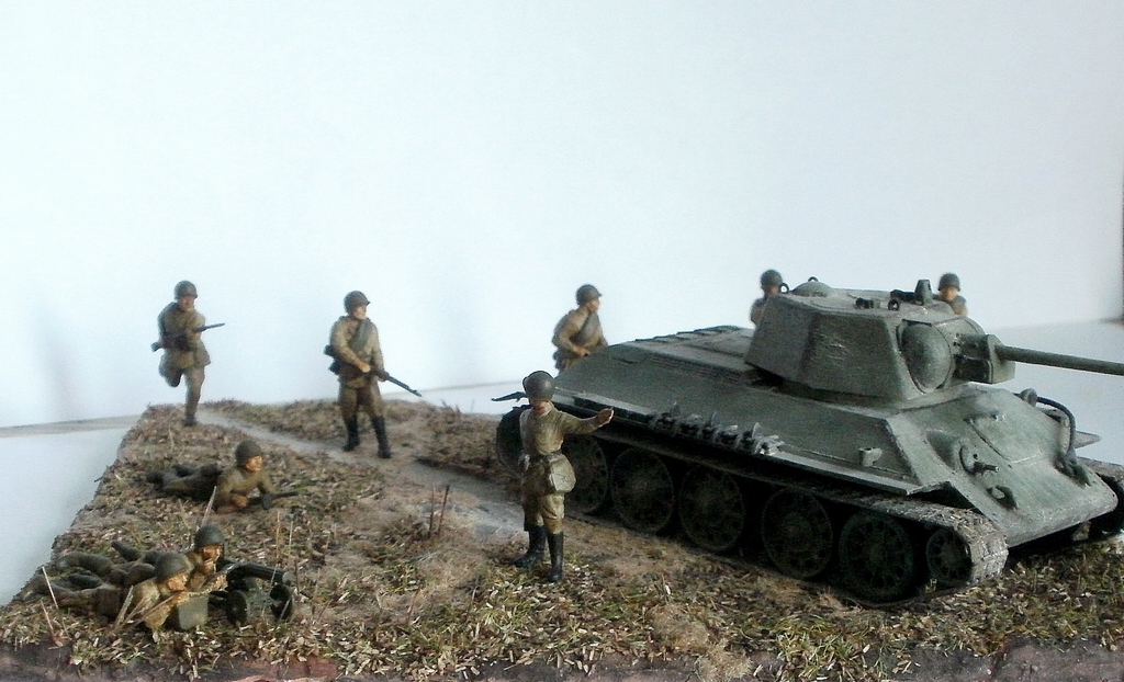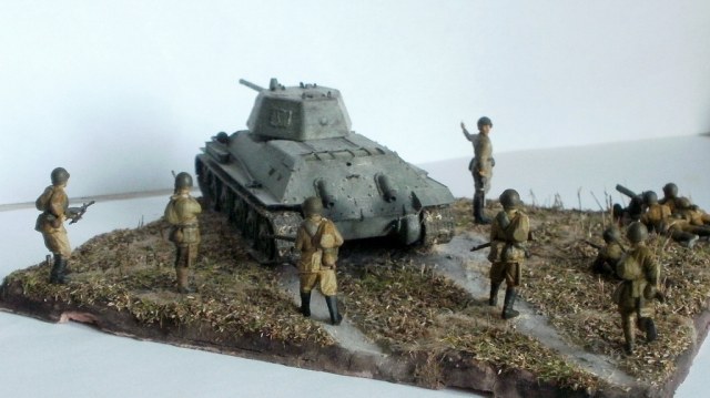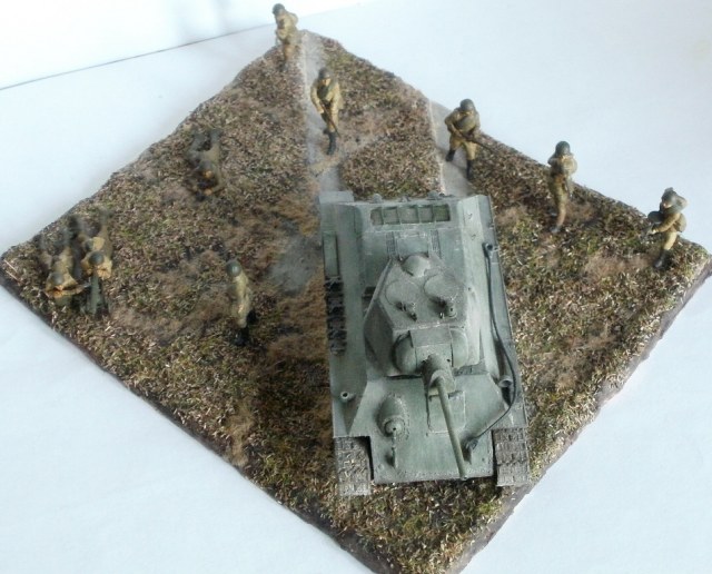 Простите за критику, но на мой взгляд, пластун с права от танка очень сильно портит композицию. И ещё, меняйте акрил от звезды на другие краски, а то блеск так и будит всё портить. Зато цвет формы, по моему, удачно поймали. Про танк ничего говорить не буду, не знаток.