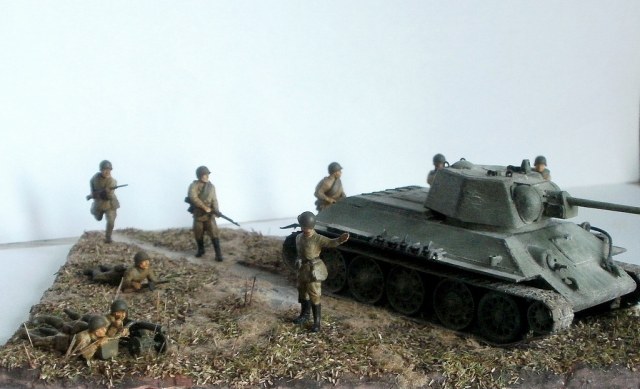 пехота из наборов "звезды", что касается "кучности персонажей"-во многих мемуарах говорится о том, что пехотинцы не выдерживали интервалов между собой и скучивались, а так же "липли" к танкам когда у противника не было сильной ПТО-тут как раз такой случай)