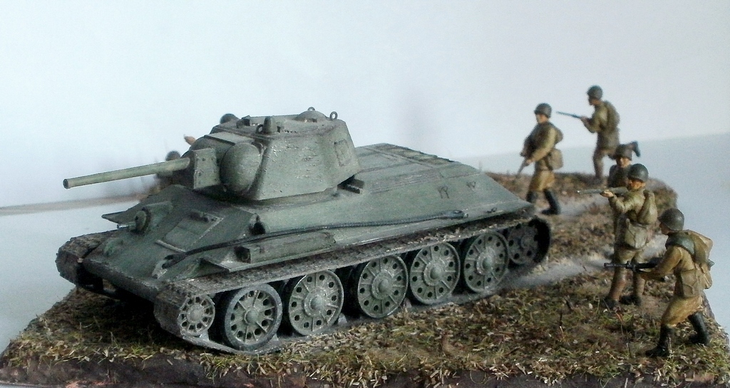 танк и пехота от "звезды" 34ка в минимальном обвесе-есть только петли для крепления брезента, рассверлено все что нужно, сделана имитация креплений крышек люков в башне, заплатка на башне, сварные швы, пулеметы-иглы, решетка мто, с люка мехвода срезал одну ресничку-вроде как потеряна в бою, так что танк не слепой) на башне пытался сымитировать так сказать "некачественную броню"