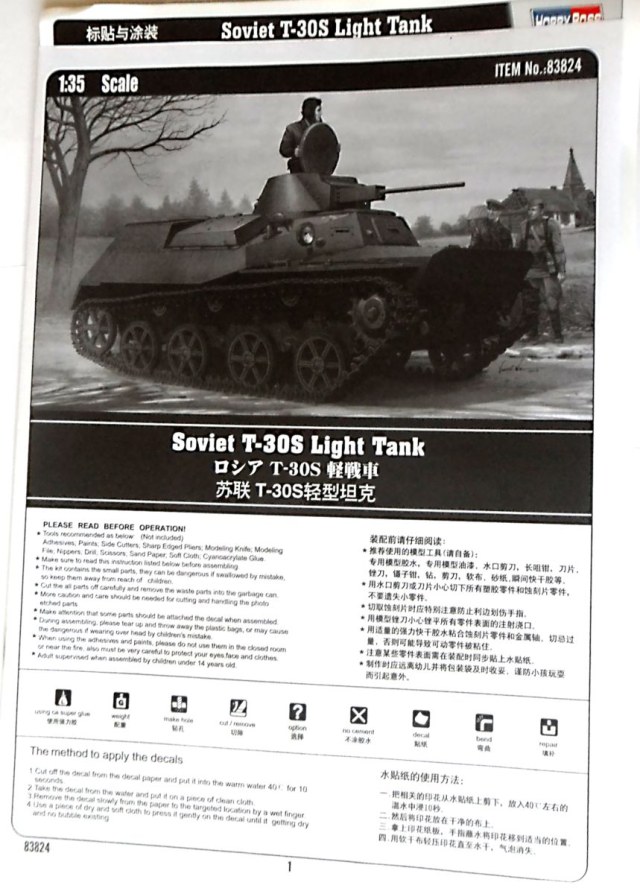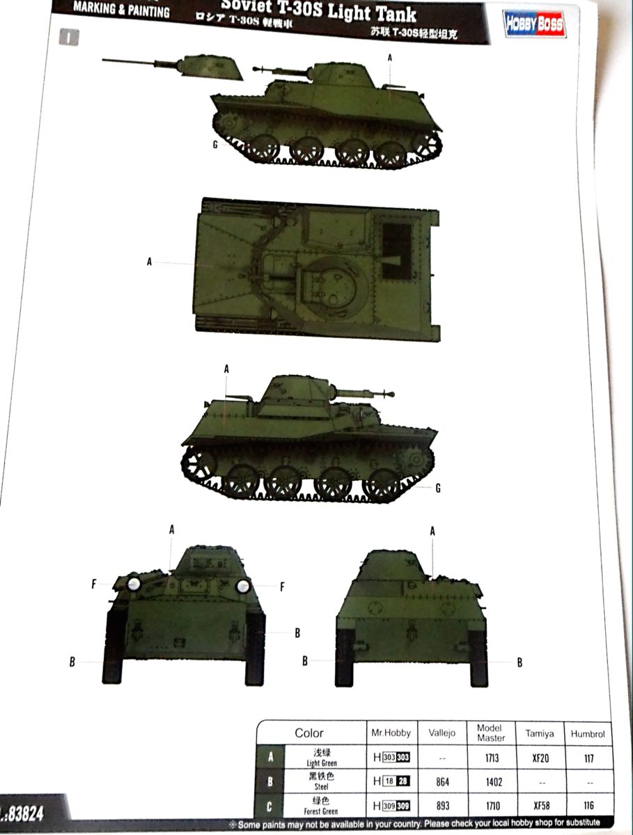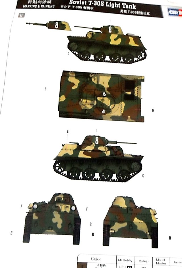 Пришла из Китая очередная новинка от "Хобби Босса" - легкий танк Т-30С (№ 83824). Танк Т-30 представляет собой сухопутный вариант плавающего танка Т-40, пошедший в серию после начала ВОВ и представляет собой упрощенный вариант без водяного движителя, со спрямленной кормой и усиленной бронезащитой. Всего было выпущено 355 танков Т-30. Потом их сменил Т-60.