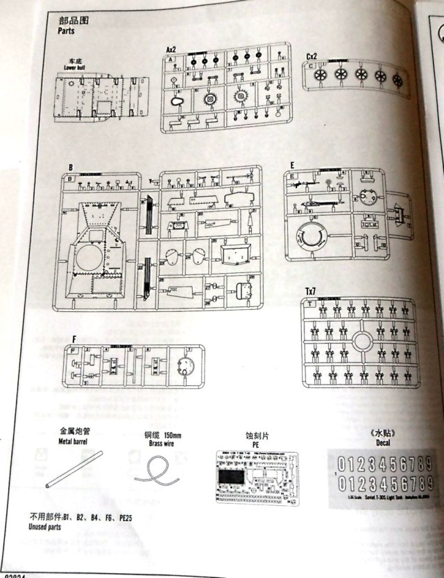 В наборе имеется два вида орудийных масок - для ДШК и ТНШ, два вида башенных люков, так что собрать можно оба варианта машины. Однако есть небольшой вопрос: в наборе имеются только "спицованные" траки, что характерно, в основном, для машин с ТНШ. Для сборки первоначального варианта (с ДШК), я думаю, желательно приобрести катки от "МастерКлаба" (я такие ставил на свой "стартовский" Т-40). Ну и у китайцев присутствуют обе фары, что характерно для Т-40, а вот на Т-30 фары, как правило, отсутствовали.