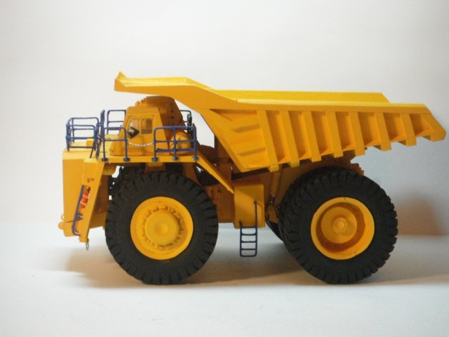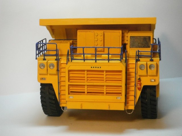Модель вызывает противоречивые чувства: с одной стороны, Белаз, самодельный, что само по себе необычно и очень интересно. А с другой стороны, чего-то не хватает, дело даже не в грязнении, модель выглядит игрушкой, нет в этом самосвале тяжести и мощи. Я допускаю, что в начальный момент своей жизни, при выезде из заводских ворот, тяжёлые карьерные самосвалы могут быть чистыми и блестящими. Но на фото видно, что модель пластмассовая и очень лёгкая.