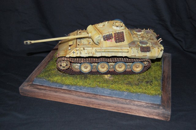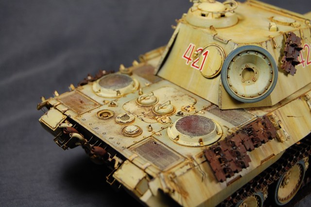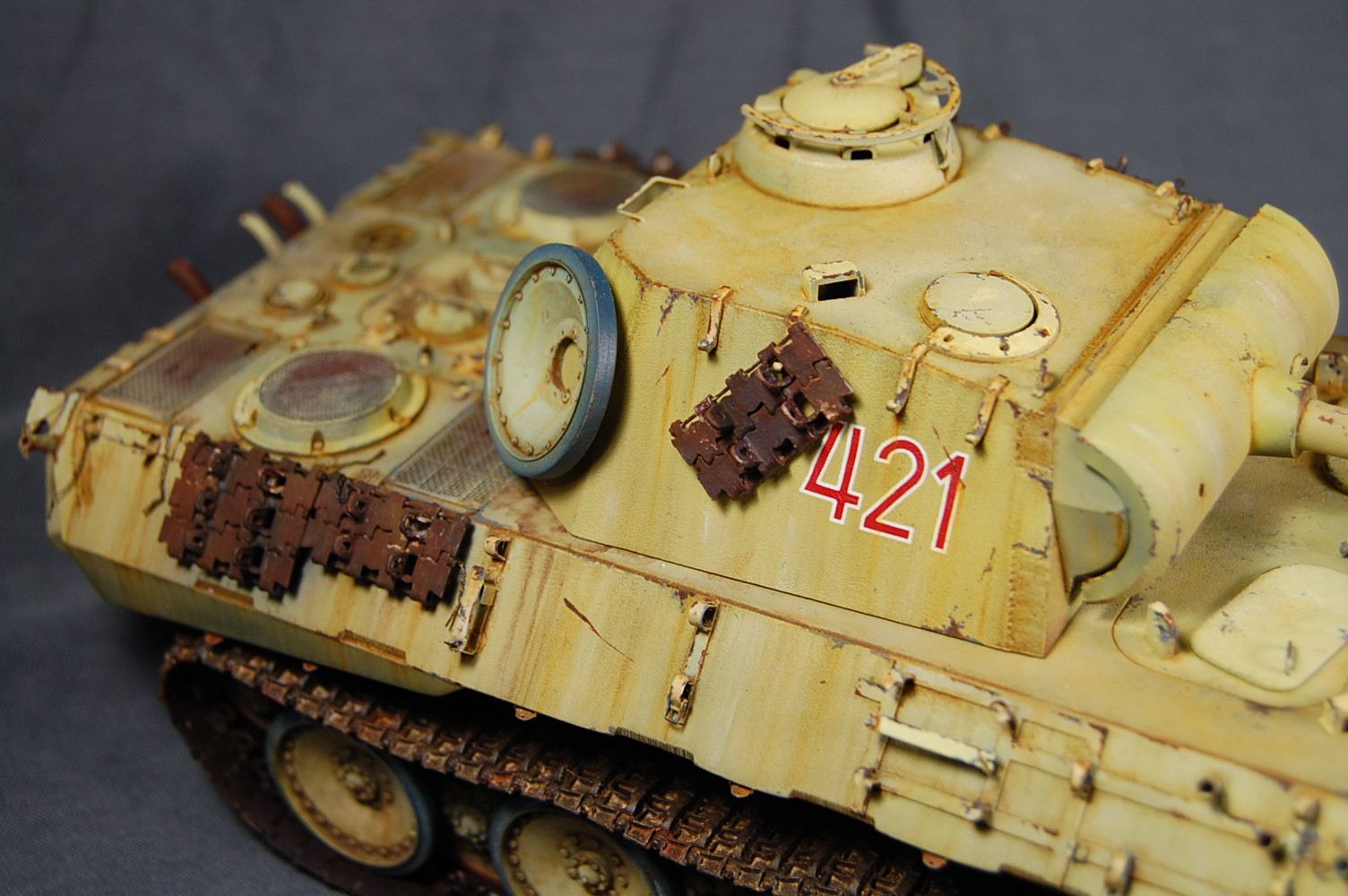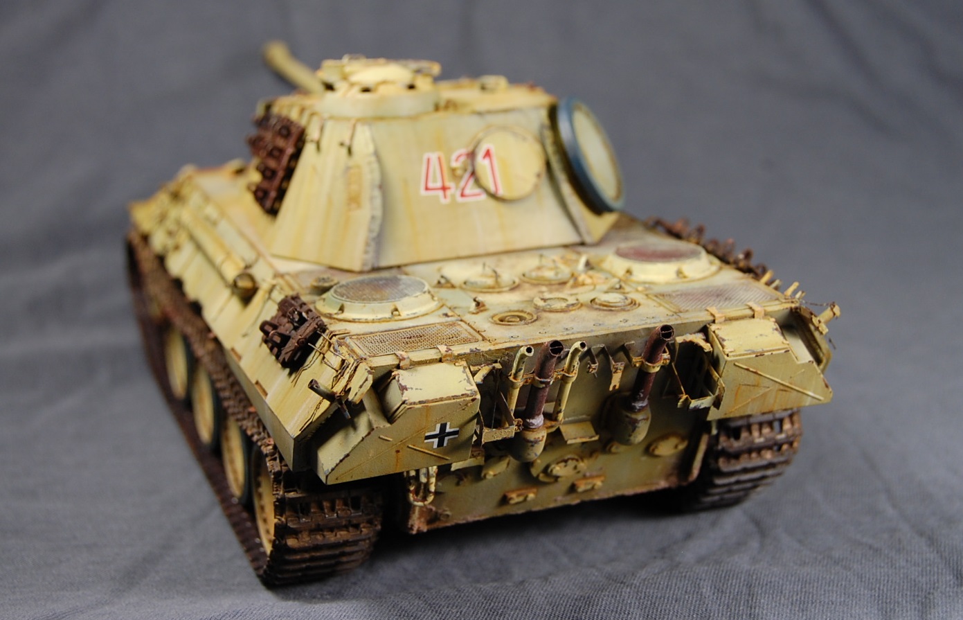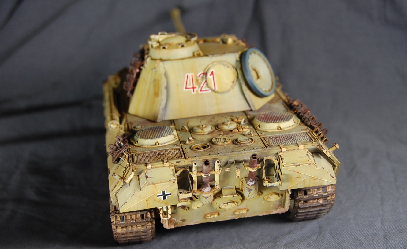 Художественная часть вашей работы мне понравилась! Что касается «Фото ушли в желтый», тому причина не корректный баланс белого на ваших фото. Можете легко исправить при помощи специальных программ либо выставить правильный ББ на камере перед съёмкой . Кстати, есть хорошая статья на Дише насчёт фотосъёмки моделей. По матчасти не понятно: отсутствие как таковых триплексов смотровых приборов, полное отсутствие крепежа люка доступа к трансмиссии. Отсутствие циммерита на вашей модели модификации А предполагает раннюю серию выпуска таковой, в таком случае должны присутствовать пистолетные порта в задней и боковых частях башни. Отсутствует отверстие под ключ в люке задней части башни, прицел должен быть бинокулярным, а не монокулярным как у вас, так же данное исполнение выхлопной системы, с дополнительными трубами, свойственно для поздних модификаций А. В общем по матчасти винегрет получается.