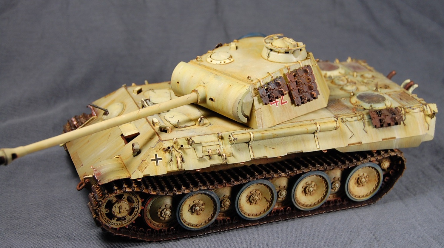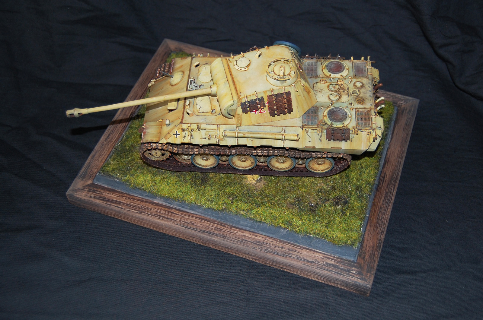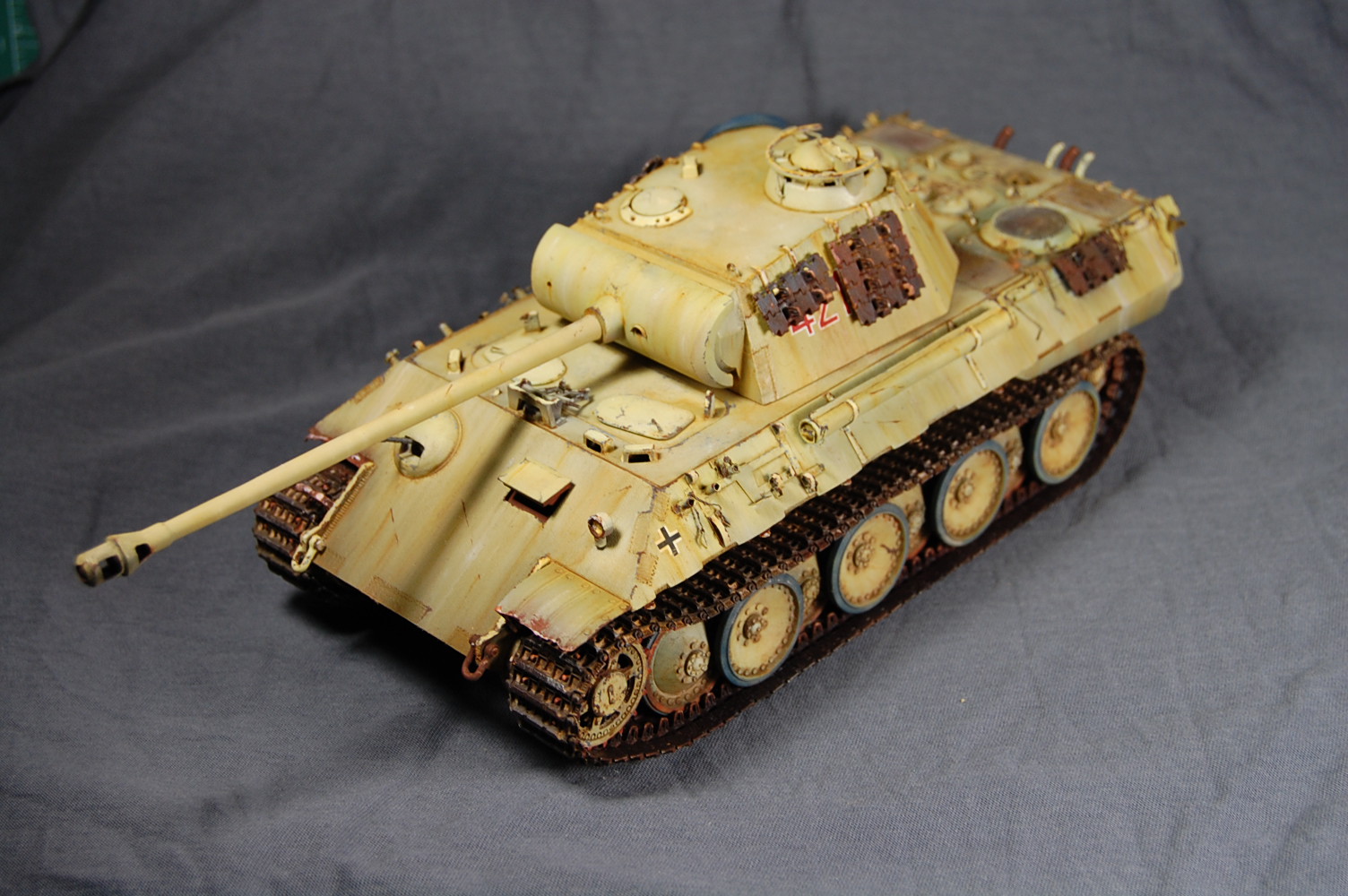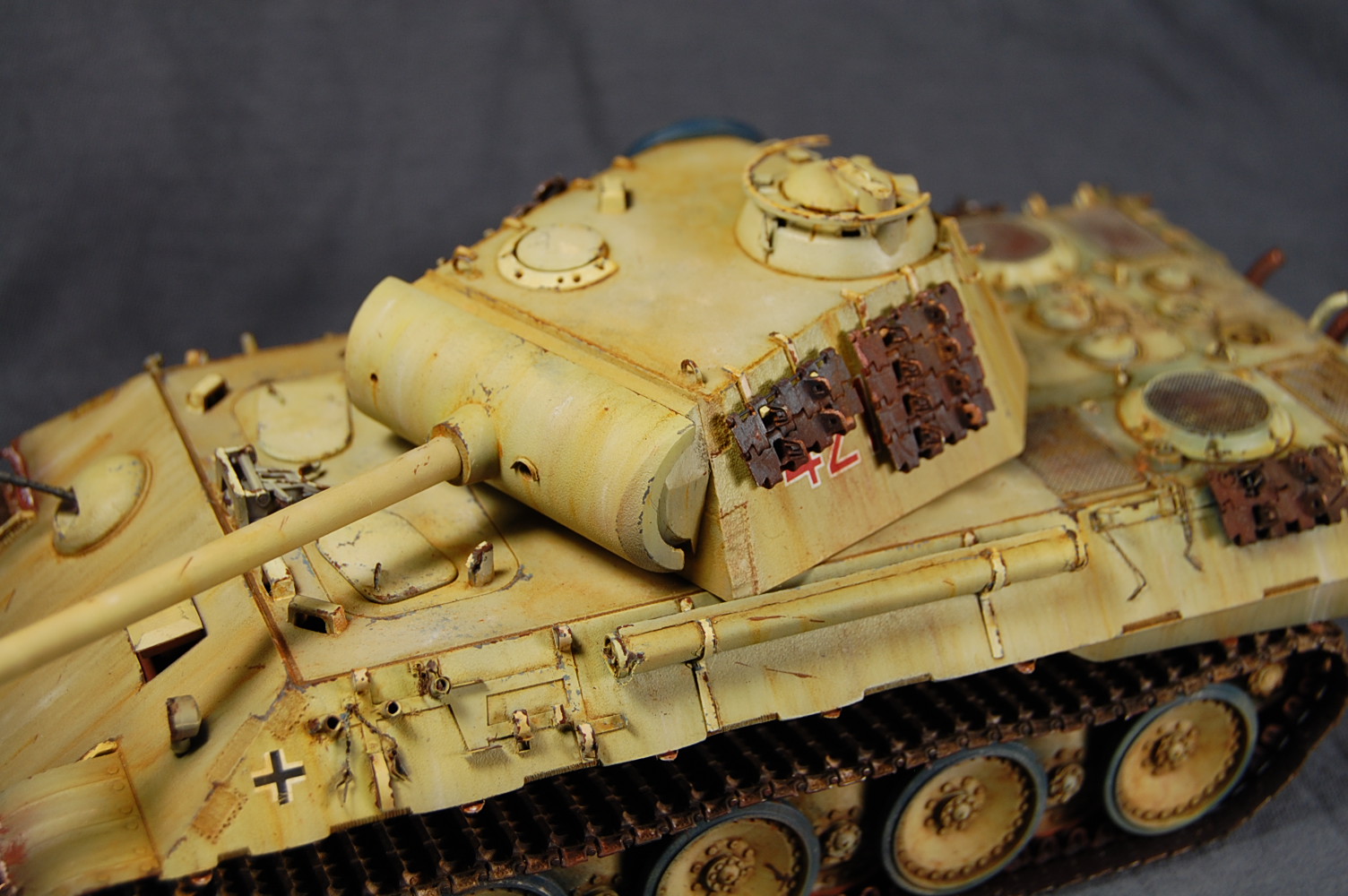 Художественная часть вашей работы мне понравилась! Что касается «Фото ушли в желтый», тому причина не корректный баланс белого на ваших фото. Можете легко исправить при помощи специальных программ либо выставить правильный ББ на камере перед съёмкой . Кстати, есть хорошая статья на Дише насчёт фотосъёмки моделей. По матчасти не понятно: отсутствие как таковых триплексов смотровых приборов, полное отсутствие крепежа люка доступа к трансмиссии. Отсутствие циммерита на вашей модели модификации А предполагает раннюю серию выпуска таковой, в таком случае должны присутствовать пистолетные порта в задней и боковых частях башни. Отсутствует отверстие под ключ в люке задней части башни, прицел должен быть бинокулярным, а не монокулярным как у вас, так же данное исполнение выхлопной системы, с дополнительными трубами, свойственно для поздних модификаций А. В общем по матчасти винегрет получается.