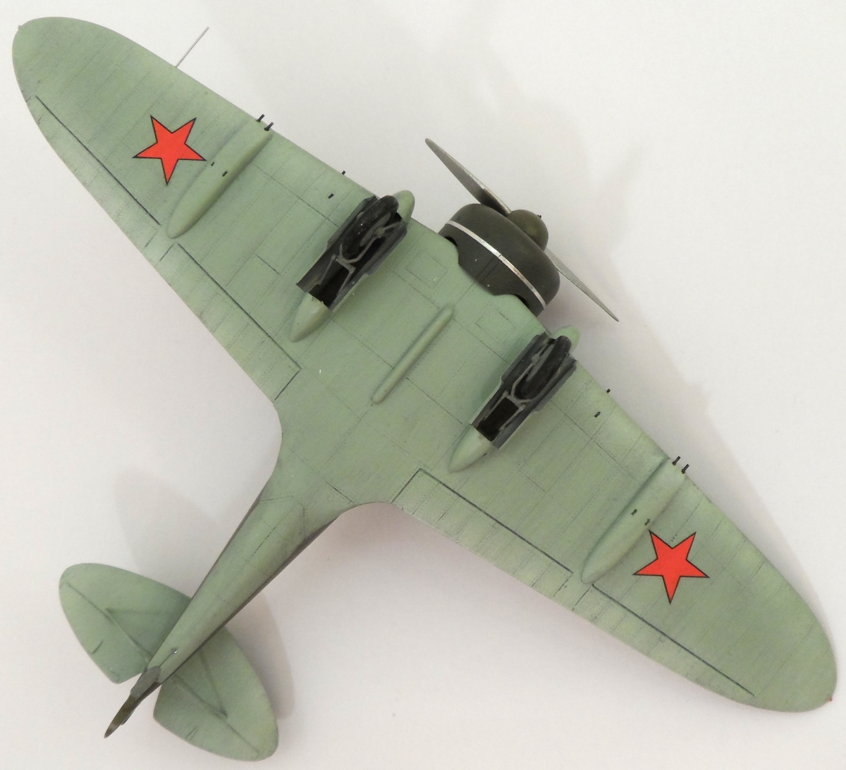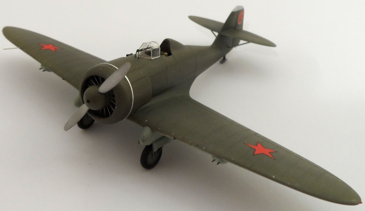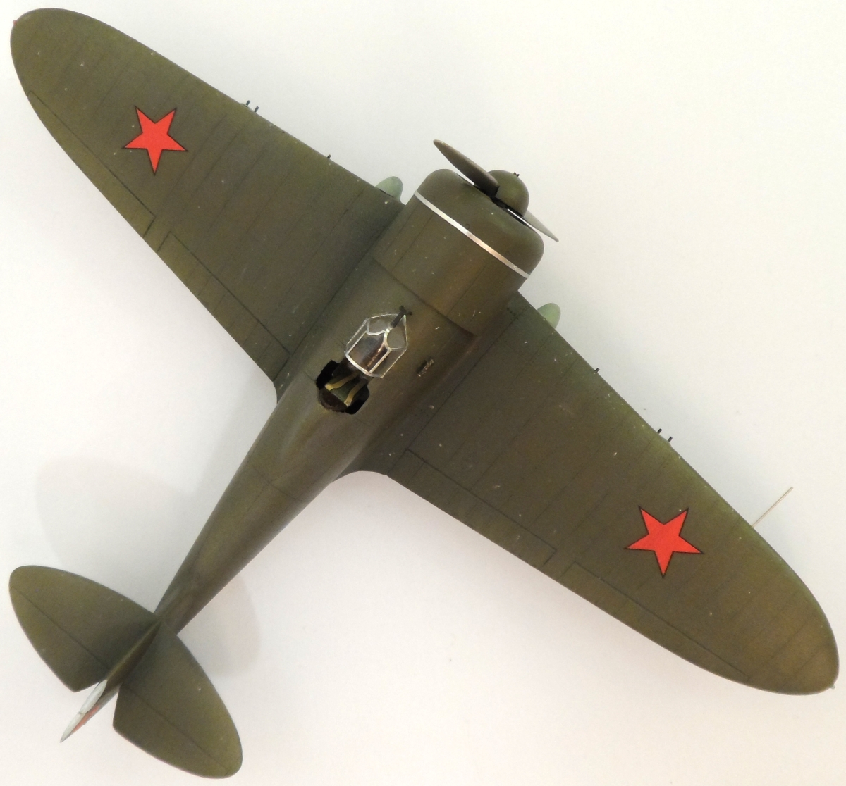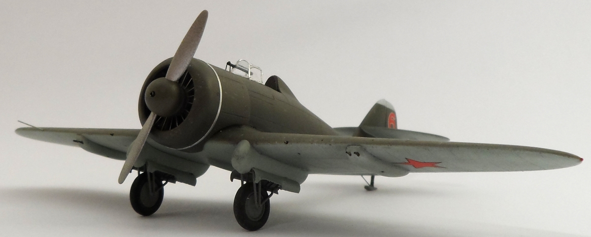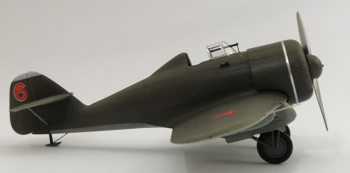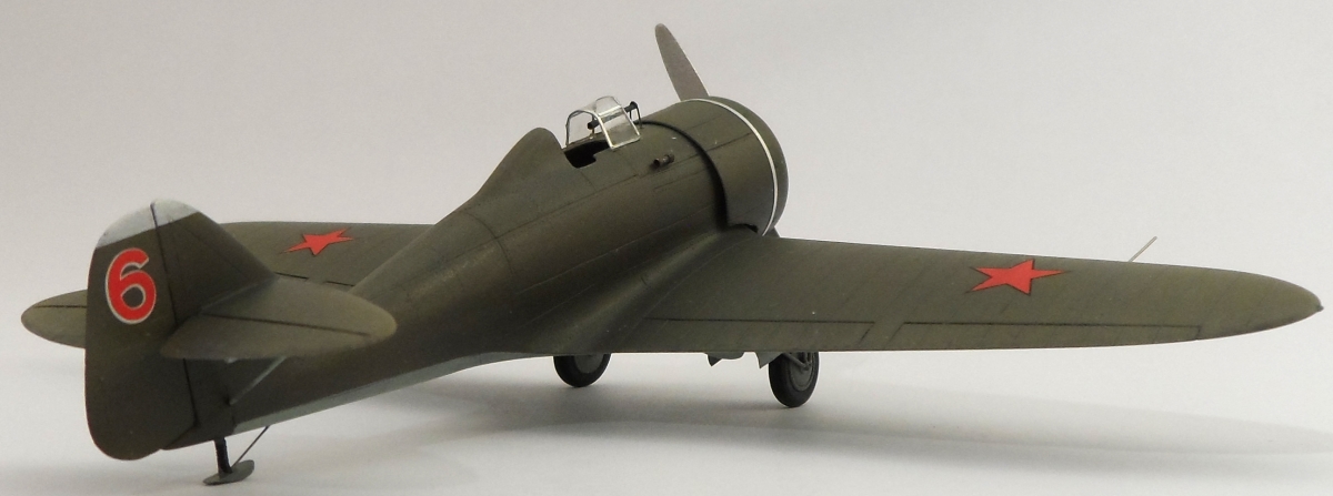 Как обычно смоляное крыло модели отлито одной деталью. В результате нет проблем с задней кромкой крыла. Из дополнительных работ: откорректированы зализы крыла, нанесена клёпка, из мет.прутков изготовлены стойки шасси, на пуансоне вытянут фонарь. Мотор заимствован у ICM, колёса Elf от И-153.