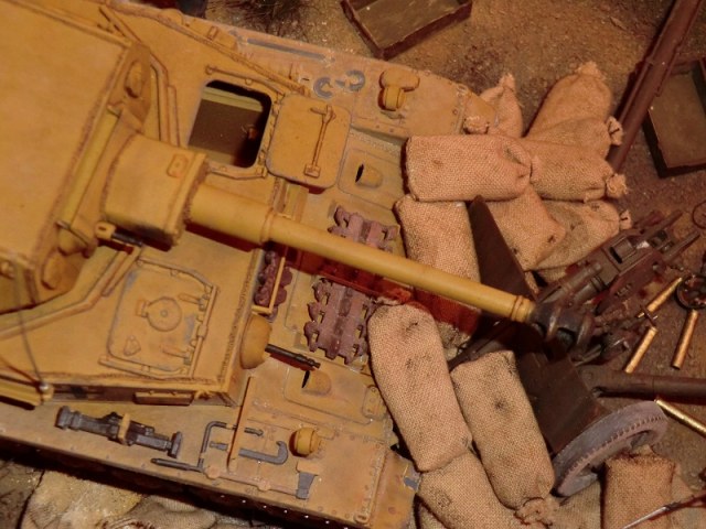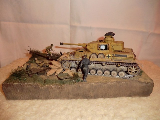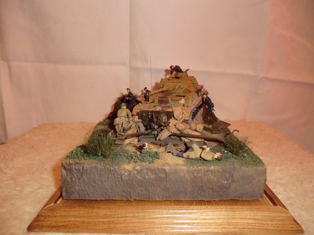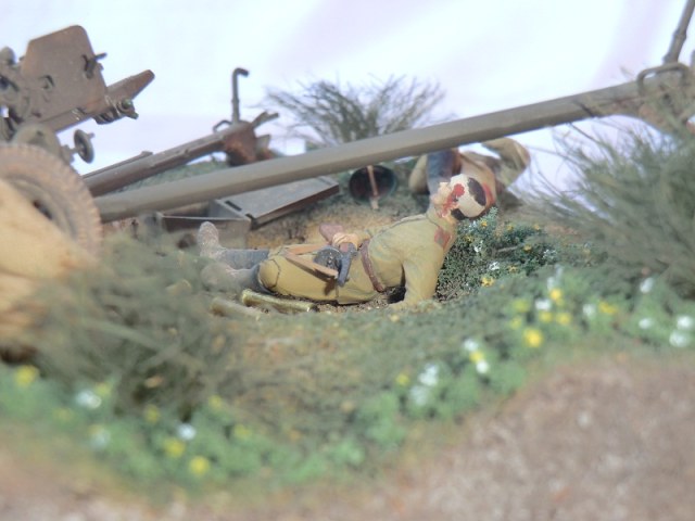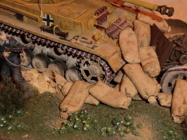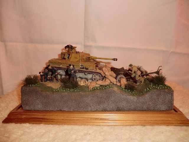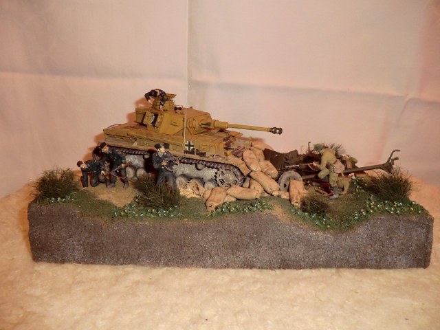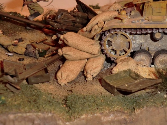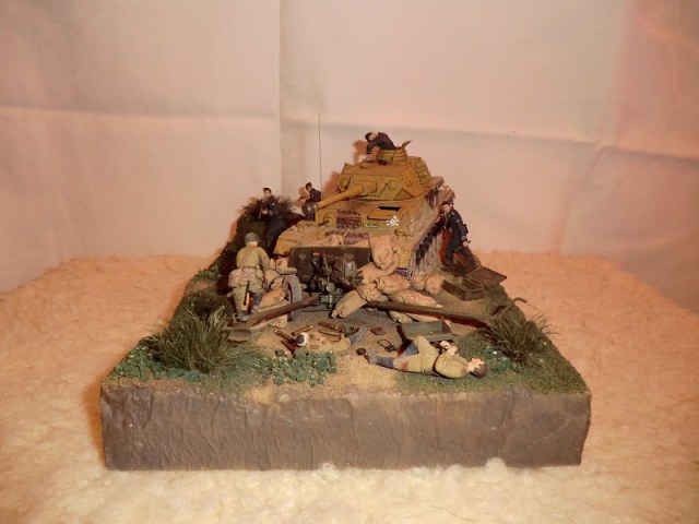 идея хорошая, сюжет есть(не продуман до конца, но есть), основание(подставка) под диораму хорошая, хороши танк и пушка, фигуры немцев получились, наш с винтовкой тоже. Мешки в топку!!!! убитый и раненный расчет пушки не получился однозначно уберити их они все портят. и пушку надо бы окопать, сформировать некую огневую позицию.