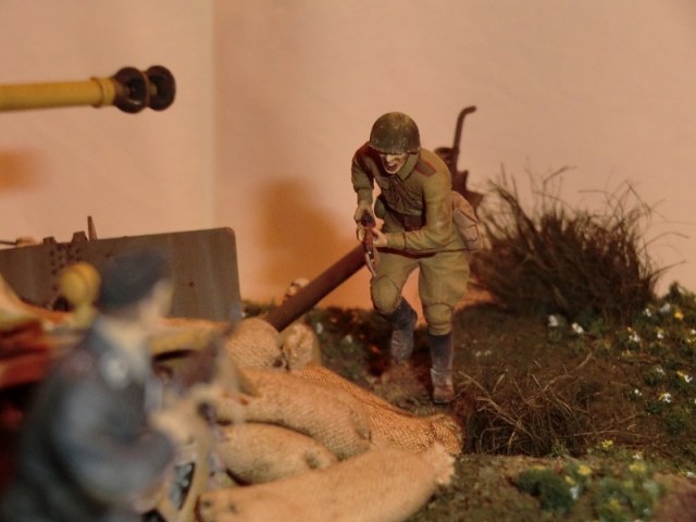 а тут такие спокойный немцы и неистовый в своей атаке советский товарищ, у него патроны кончились?совершенно для меня не понятно откуда он бежит?если он из орудийного расчета-то как то поздно спохватился:проспал наезд танка на пушку и даже немцы все повылазили(судя по позам-не сильно торопились), если он из пехотного прикрытия-тогда вообще вопрос:один в штыковую на танк?проще пострелять было)