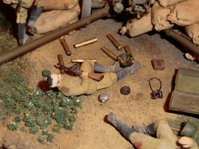 3.Неторопливость танкиста по левому борту. События ведь происходят прямо среди русских позиций! В любой момент может кто-то выстрелить(не только те кто на диораме, но и из-за пределов ее). А он стоит не прикрытый броней, и не таится, тем более что только что убили его товарища на башне.