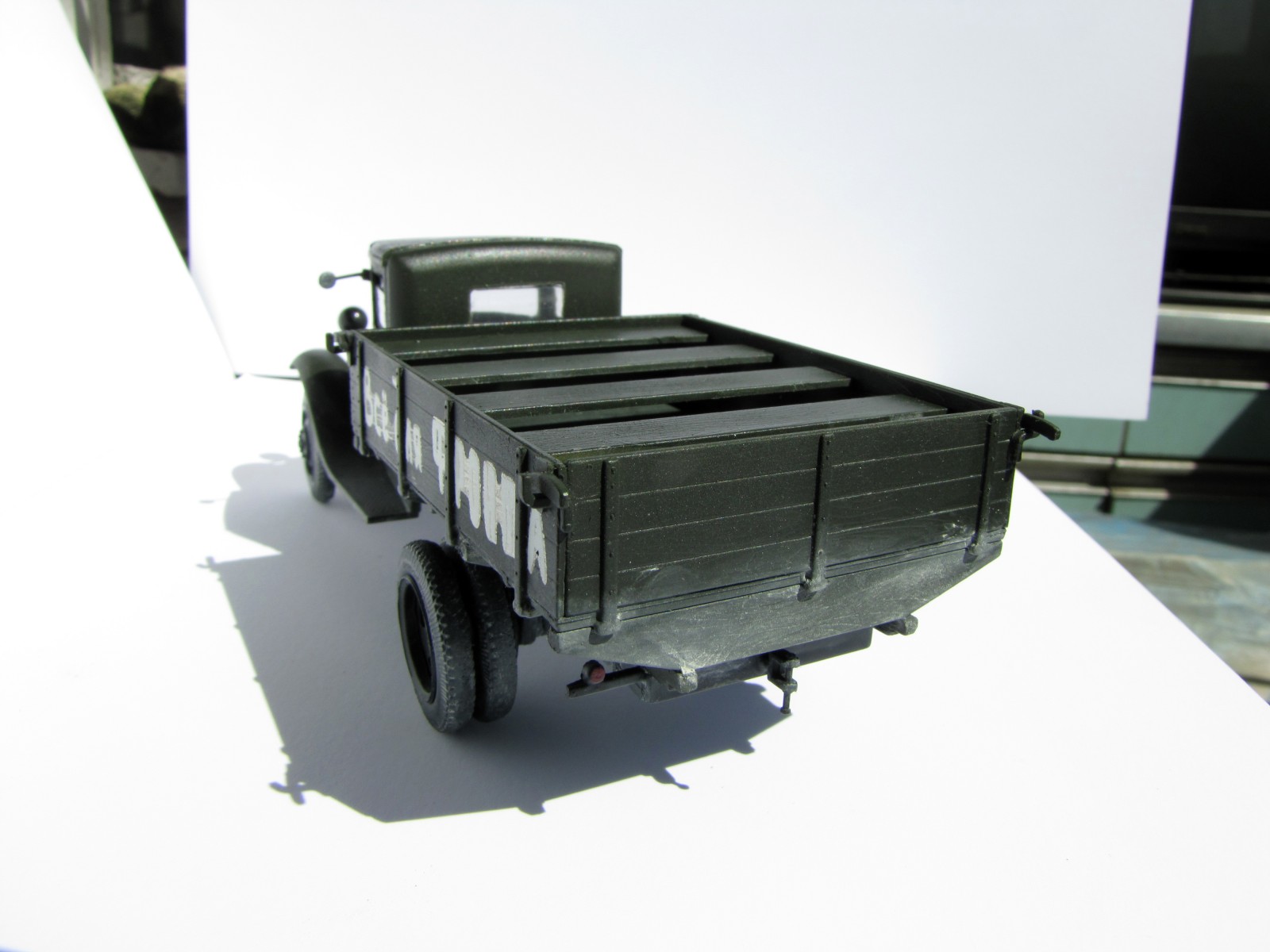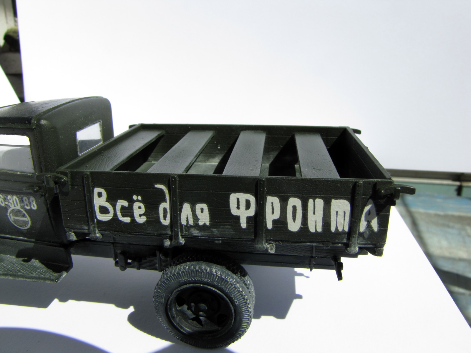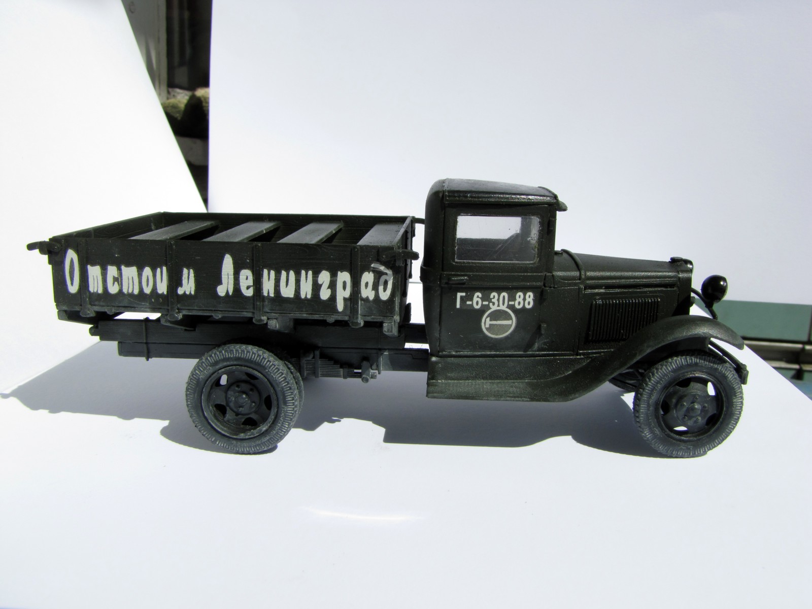 Во-первых, вы не попали в цвет - он у вас ушёл в черноту. Блеск декалей - это минус. Эта модель "Звезды" практически ничего не имеет общего с прототипом - вы вообще ничего не переделывали. Красочный слой толстый, местами с шагренью. Сборка во многих местах неаккуратная. Всё окрашено очень однотонно, модель выглядит довольно скучно. Да, и декали - от балды - этот номер с молотком в круге взят от полуторки в виде "Летучки" с известной фотографии - с Ленинградом ничего общего.