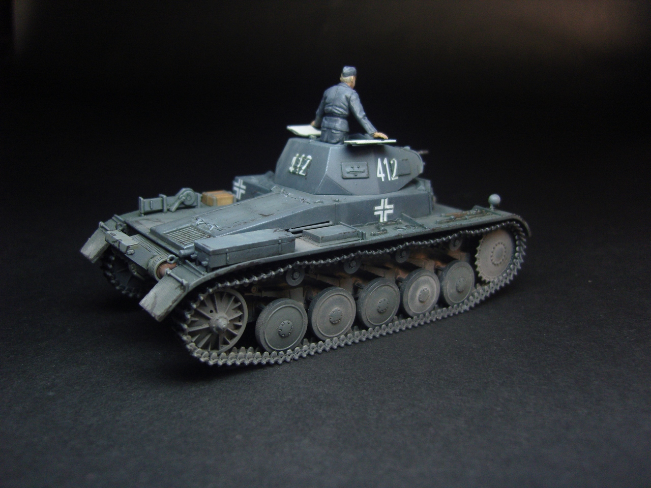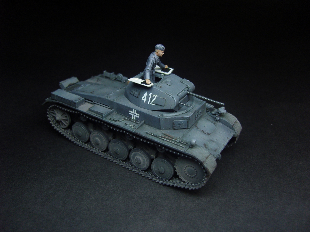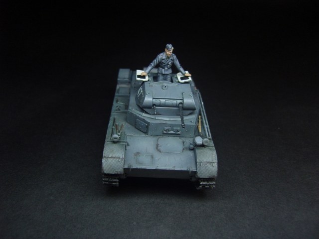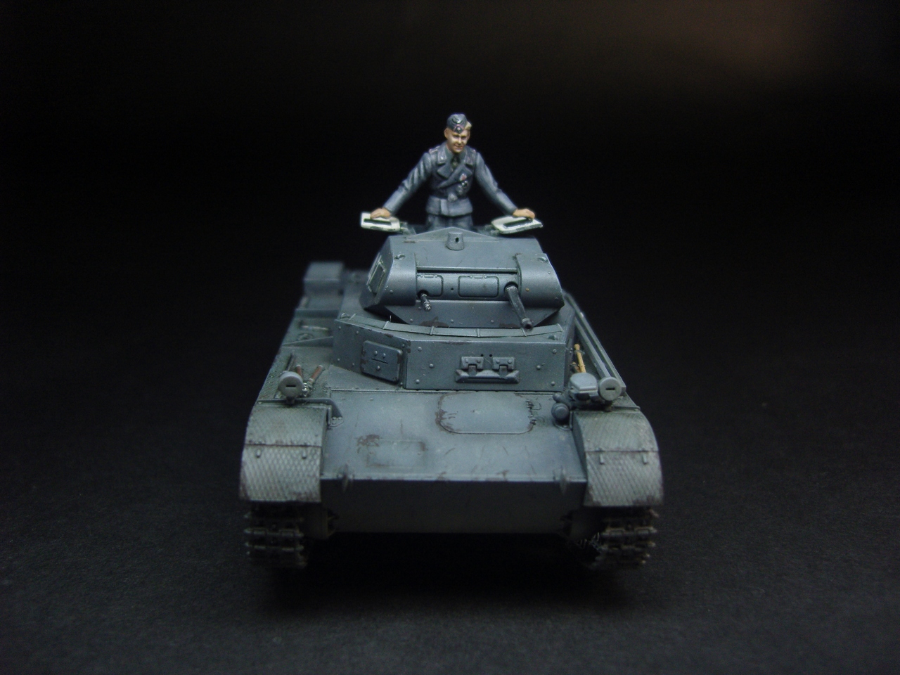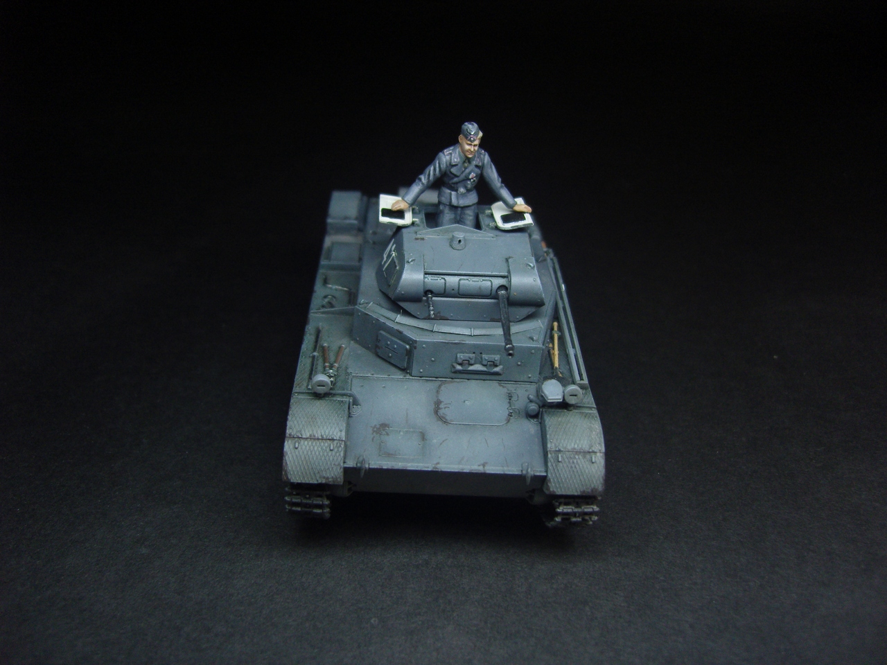 Годная модель, фигурка понравилась, добавить бы металлического блеска карандашиком, люк изнутри слишком белый и разрыв трака по левому борту.