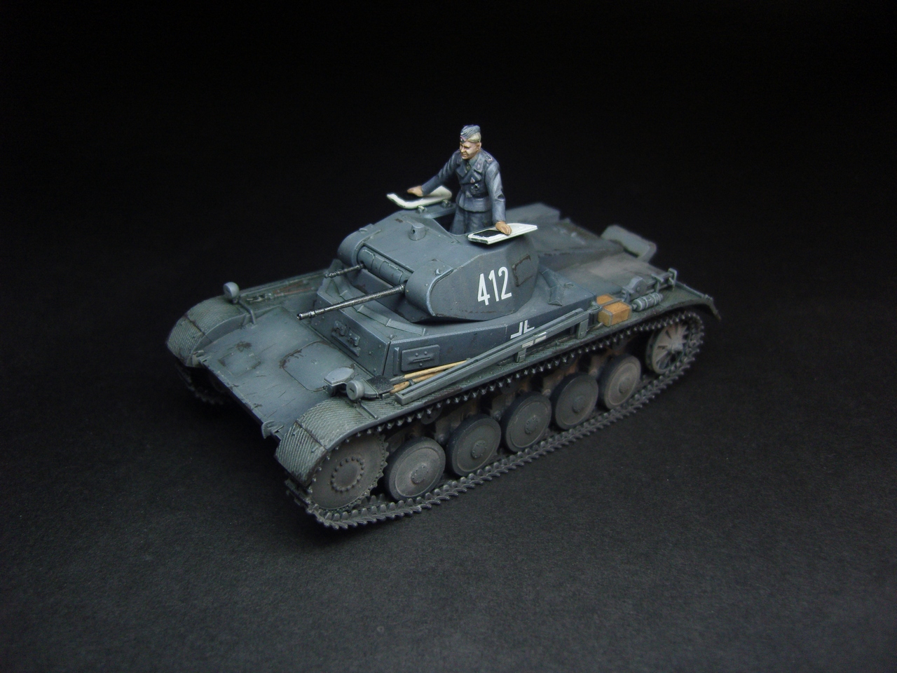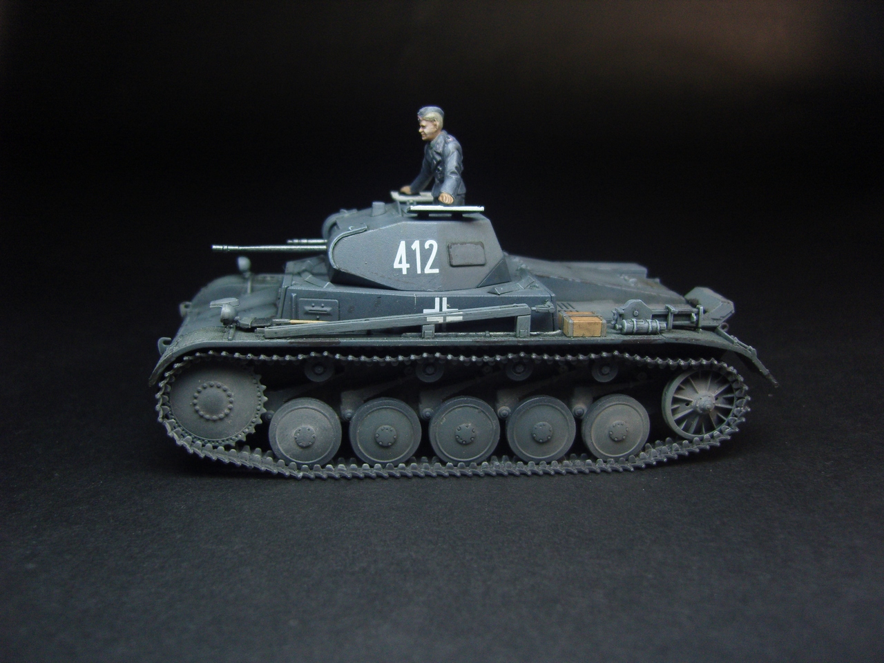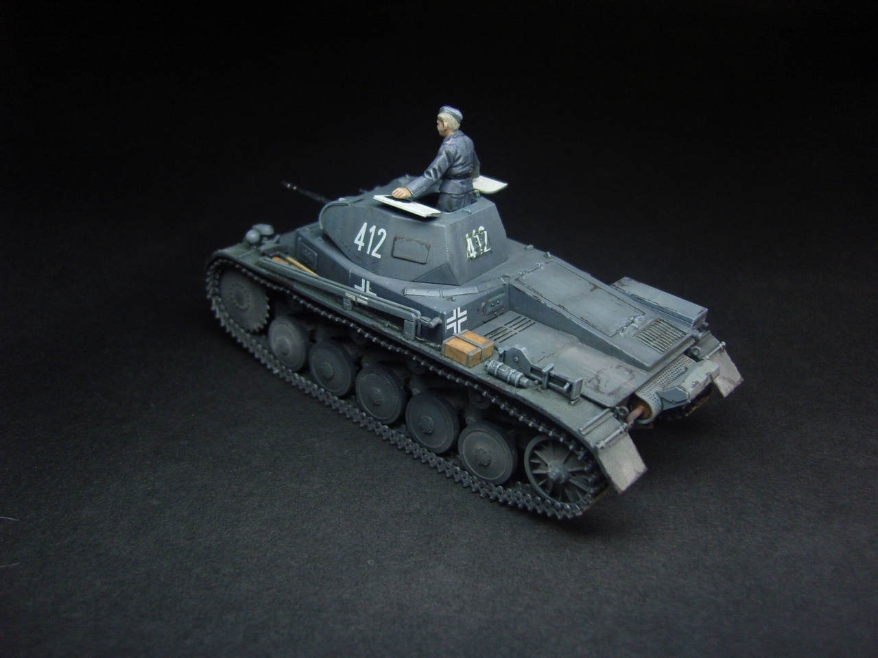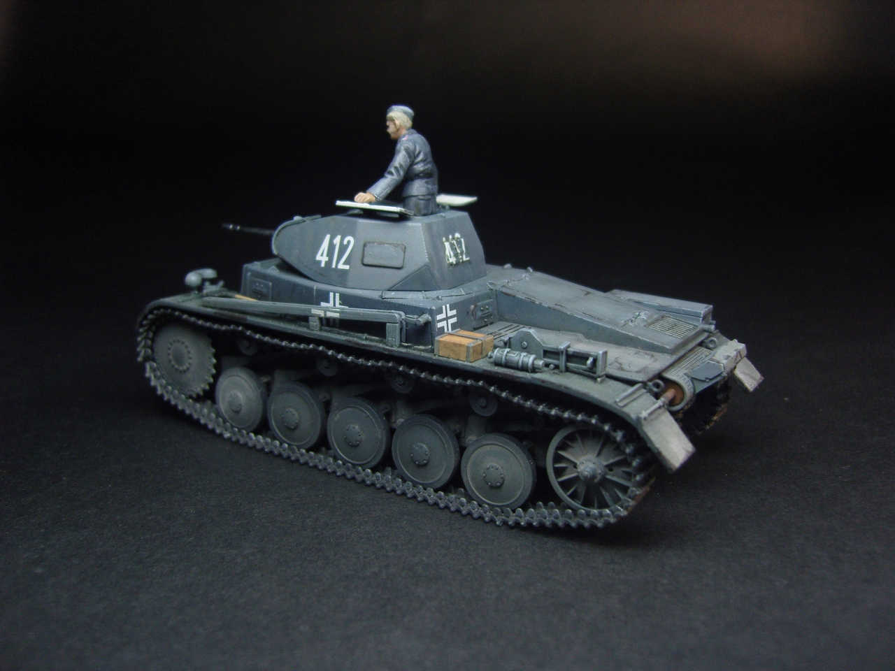 Годная модель, фигурка понравилась, добавить бы металлического блеска карандашиком, люк изнутри слишком белый и разрыв трака по левому борту.