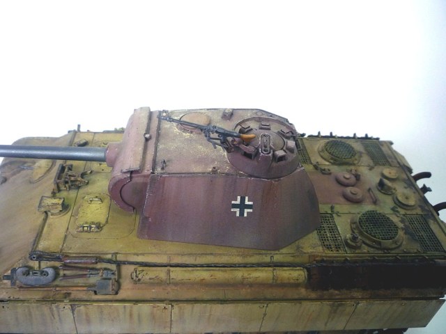 Козырёк над отверстием с круглым отверстием с решёткой на крыше МО - признак поздней машины. Ранняя машина с большой вероятностью имела ещё крюк-фиксатор люка в открытом положении на большом люке над двигателем. На модели нет демпферов-ограничителей по бокам от люков: пластики, между которыми зажата по-моему резиновая вставка.
