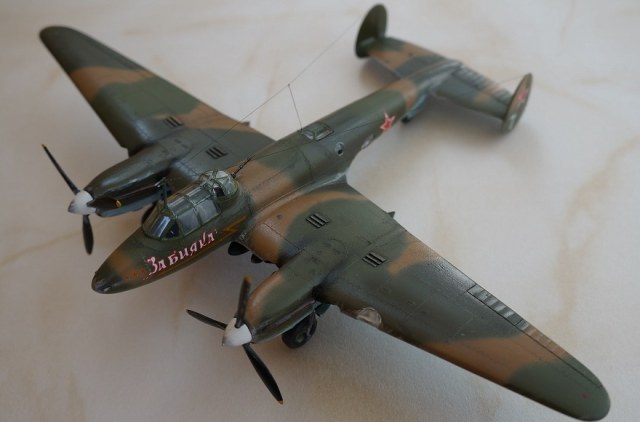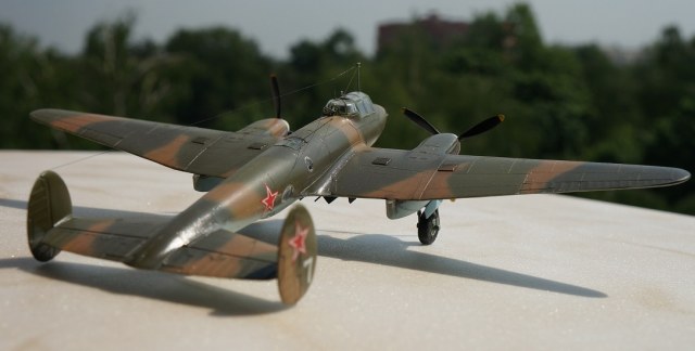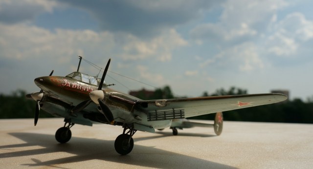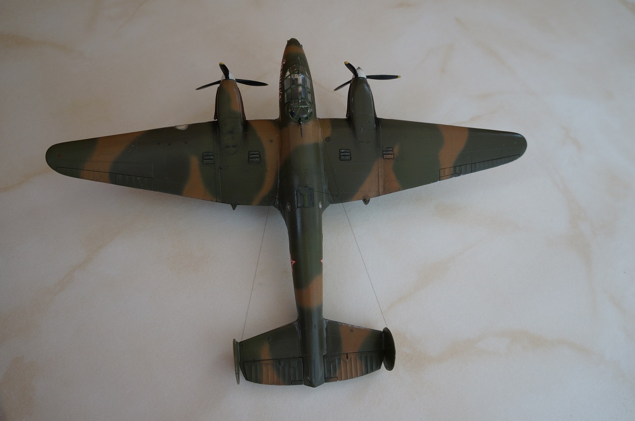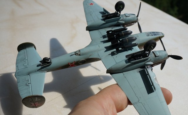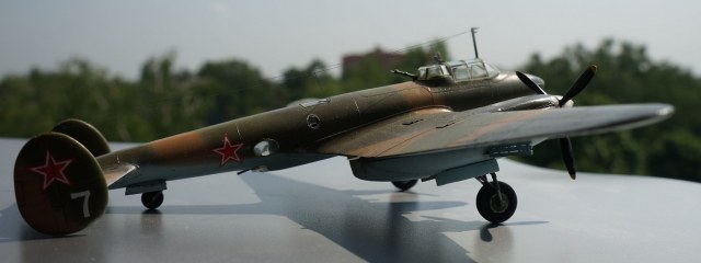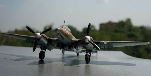 Очень неплохая модель! Но,но . . . Конечно, проигрывает внешняя расшивка, да и жалюзи на верхней части крыла "раскрытые" в противоположную сторону, режут глаз. Коричневый цвет не совсем тот. Компенсатор поворота турели штурмана приклеен не правильно. Решетки прижать бы к крылу надо. По-видимому, матчасть "пешек" не изучалась.