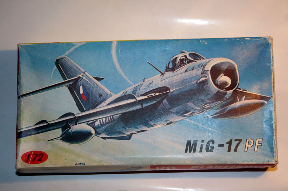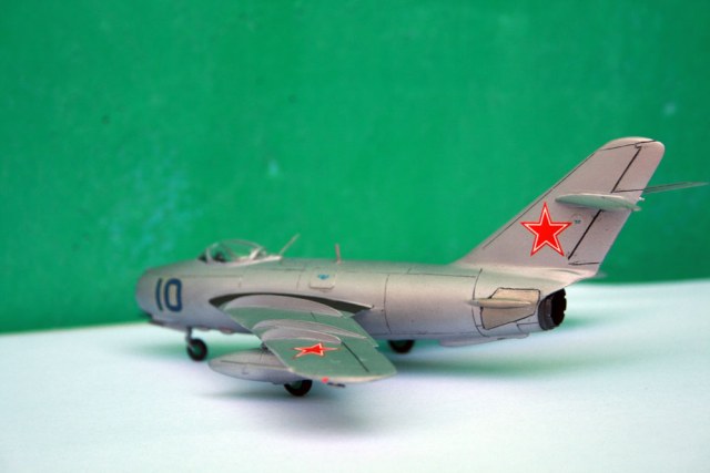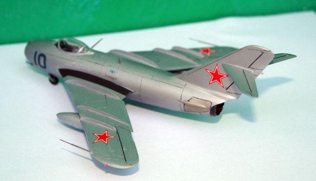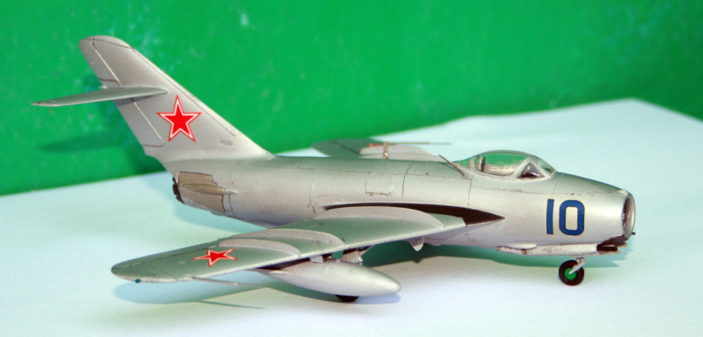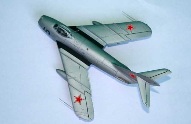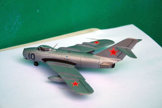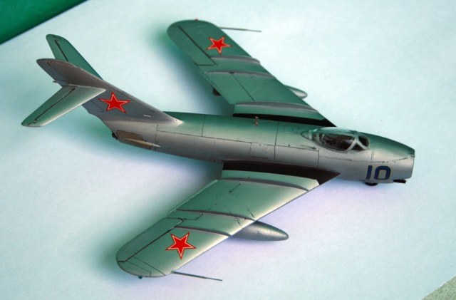 Давно хотел сделать модель этого самолета. Поставил цель закончить стройку именно к 25 мая, дню рождения отца, служившего срочную службу на этом самолете в Михе-Цхакая. В закромах давным-давно лежал КРшный МиГ-17ПФ. Модель хорошая, но совсем не правильная. В закромах лежала смоляная кабина на МиГ-15, прикупил смоляной нос АРМОРИ. Нос от модели, до кабины был отпилен и прилажен смоляной. Отпилил киль, немного изменил его геометрию и при установке увеличел стреловидность. Стабилизаторы переточены по чертежам. Крылья распилены вдоль. Установил вставки, одним словом постарался приблизиться к чертежам. Фонарь взял от КРшного МиГ-15, мне он показался ближе к чертежам. Их доширака вырезал аэродинамические гребни. Слегка расшивку нарезал, но совсем минимум. Красил Тмиевской серебрянкой. Звезды, номера сборные. 10-борт по рассказам отца был у него. Финишный полуматовый лак.