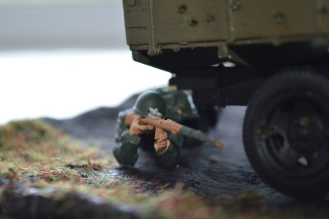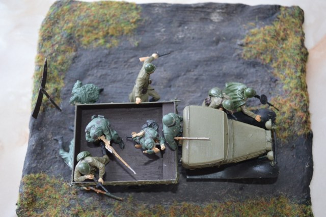...При таком расположении фигурок,эта композиция должна называться "С ходу-в бой!" или типа того.Если машина с пехотой попадает в засаду,народ сразу залегает,чтобы не попасть под огонь атакующих,а здесь классическая атака,только спешиваются с машины,а не с БТТ.