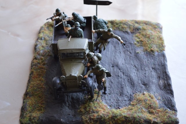 Общая композиция хорошая, но в диорамах не спец. по недостаткам. Слишком много "дырок" от пуль, неверная окраска, фляжки защитного цвета, не металлик надо было, ложи у оружия надо было красить под дерево. Матчасть оружия в общем стоило бы посмотреть. ДП одной рукой удерживать тяжеловато будет, да и неудобно. Ну и блеск, практически вся одежда блестит.