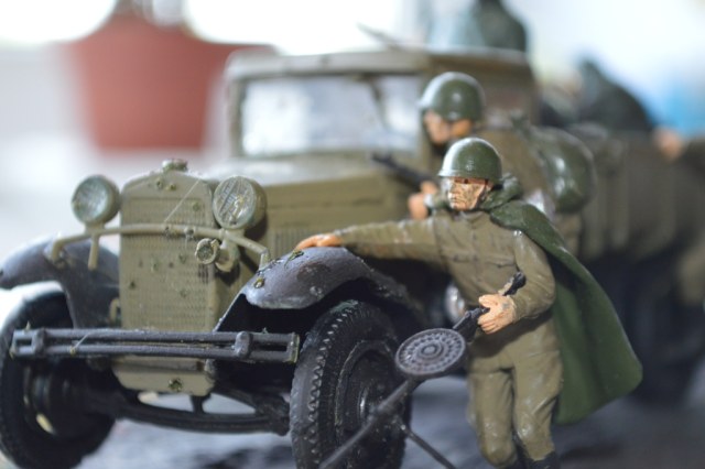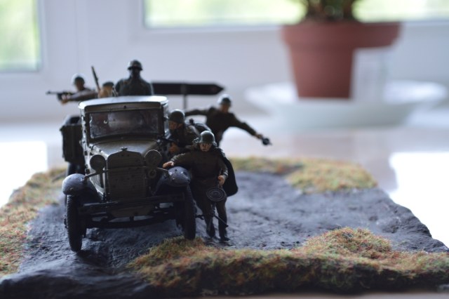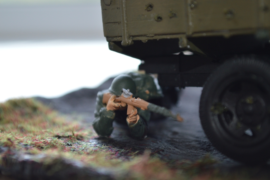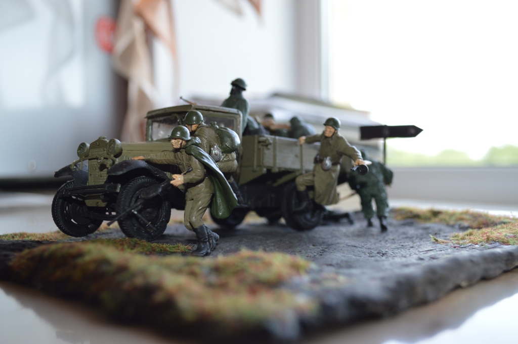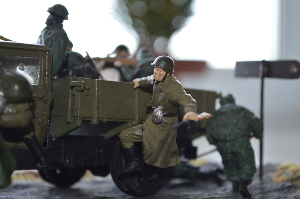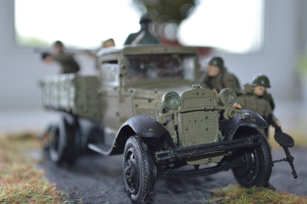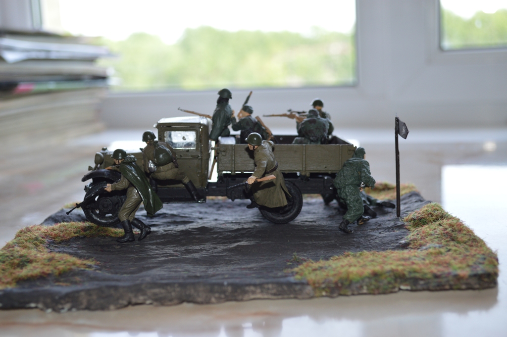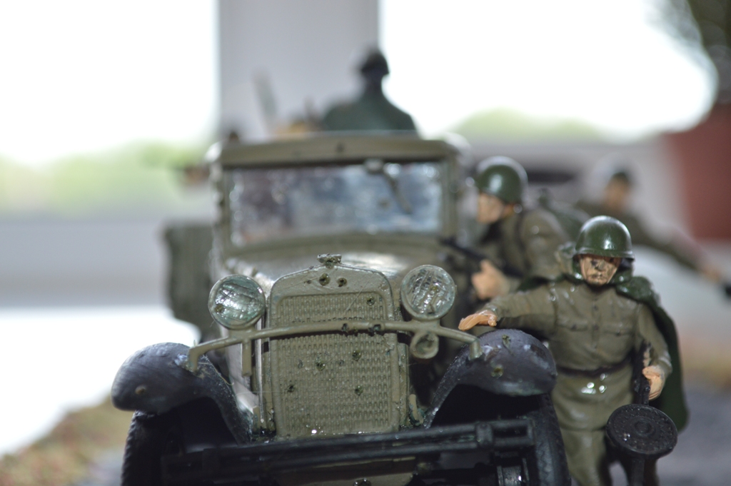 На диораме присутствует модель автомобиля от "Звезды"-ГАЗ-АА. Модель мне очень понравилась, для меня очень трудная сборка. Вмятину на левом крыле и пробоины от пуль делал паяльником.