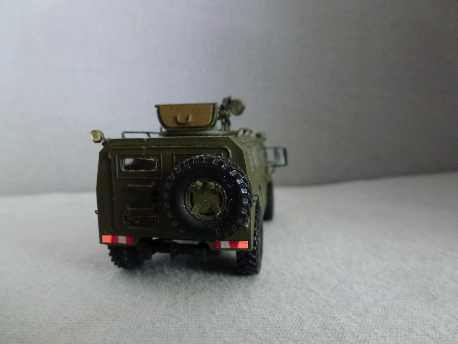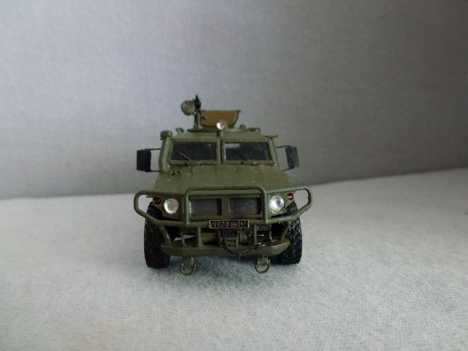 Что сделано - в ТЛГ режиме - изготовил козырьки и ручки, сделал хвостовики рамы(получились упрощенными Тобразными) и фаркоп...на бампер повесил петли....боковые стойки кенгурятника сделал гнутыми а не плоскими....сделал петли для шанца и троса....маленькие коушы появятся - повешу трос...петли крепления троса сделаны полукольцами - можно укоротить и подогнуь...фары Эльф....дворники из ворса кисти...задние зеркала поставил...изготовил с 0 стойку крепления АГС-17, на гранатомете ствол заменил на шприцевой.....Штатные стекла не хотят вставать - пришлось вырезать из бутылочного пластика...он толстый и его можно подточить надфилем....Номера от Армори, принадлежность ВДВ....есть ли такие в ВДВ не знаю - так что за это не пинайте....хочется чтоб десантура в таких поездила....красить белым окантовку не стал - упало зрение, не буду упираться....