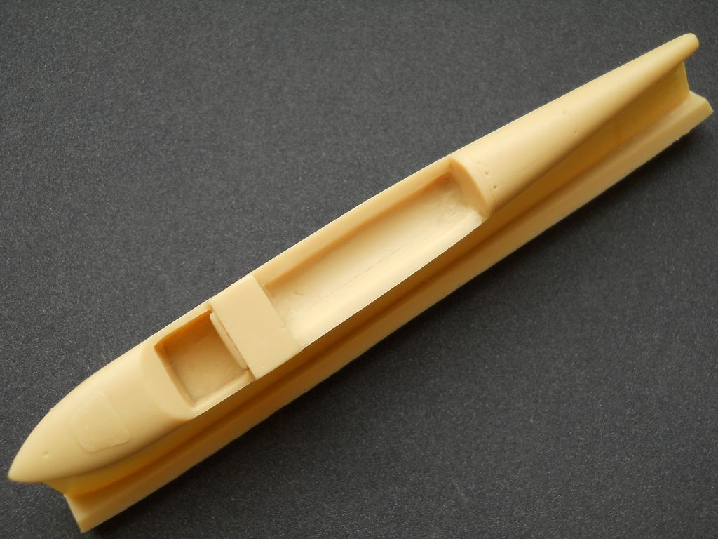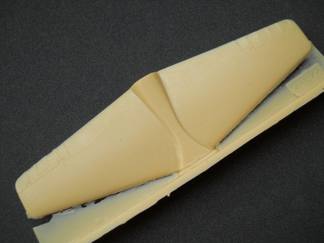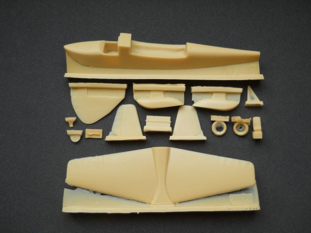 Литьё не очень качественное, довольно много пузырей. Фюзеляж и крыло отлиты целыми деталями. Кабина даётся углублением в фюзеляже. Интерьер в виде нескольких деталей. Ваку-фонарь неплохого качества. Декаль на первый взгляд смотрится нормально. Маленькая плата фототравления содержит спицованные диски для транспортной тележки.