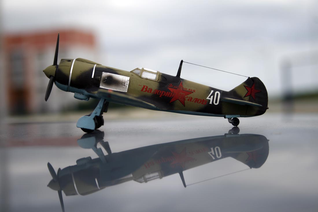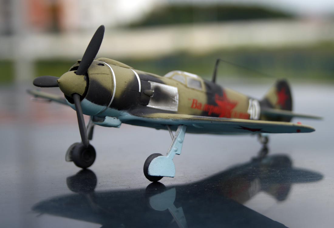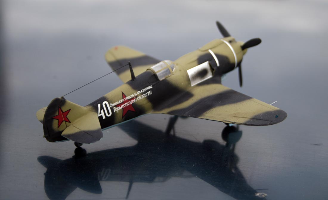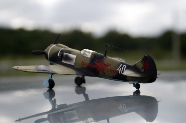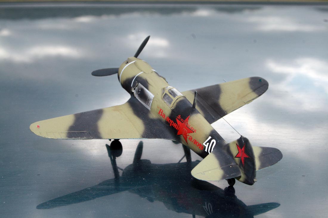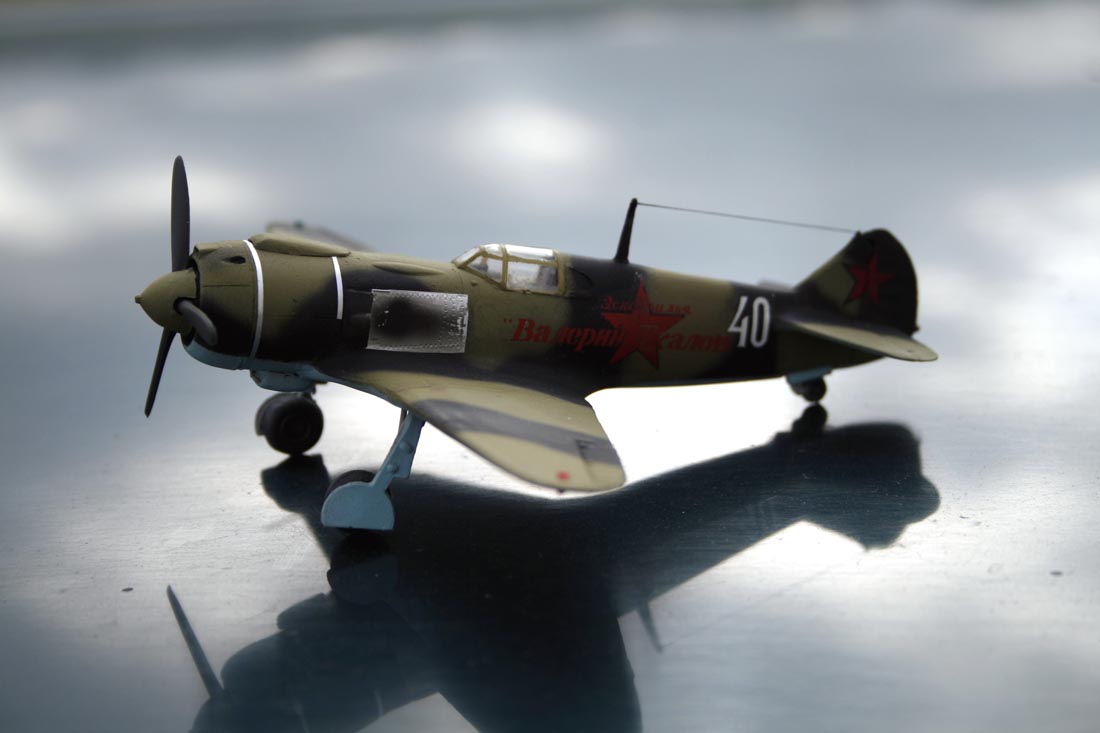 Модель собиралась давно, даже не помню когда. Производителя не помню. Черный такой, угрюмый пластик. На борту были нанесены надписи Валерий Чекалов от Ил-2. Копаясь в закромах отрыл обрезки декали на Ла-5 от Траверс. Сегодня до обеда шёл дождь и удалось посидеть с моделью. Содрал старые надписи, подкрасил поверженную краску. Нанес декали. Задул полуматовым лаком. Установил потерянное ПВД. Огни БАНО, натянул тросик антенны. Зеленый конечно не тот, но перекрашивать не стал, нет запаса звезд с чёрным кантом.