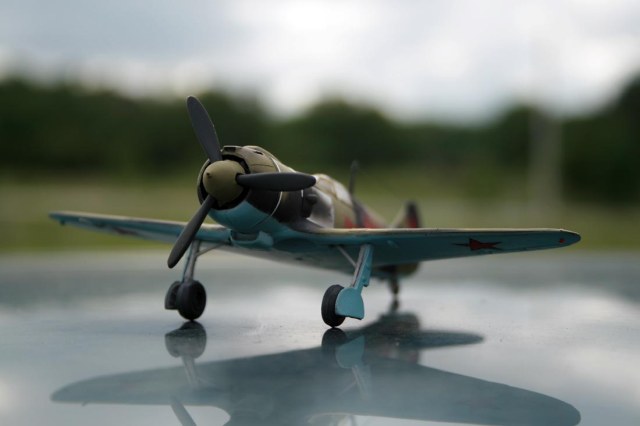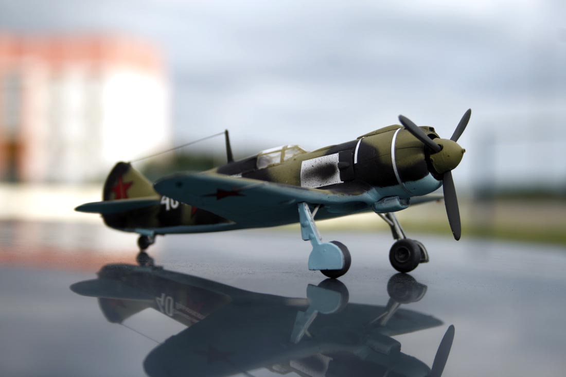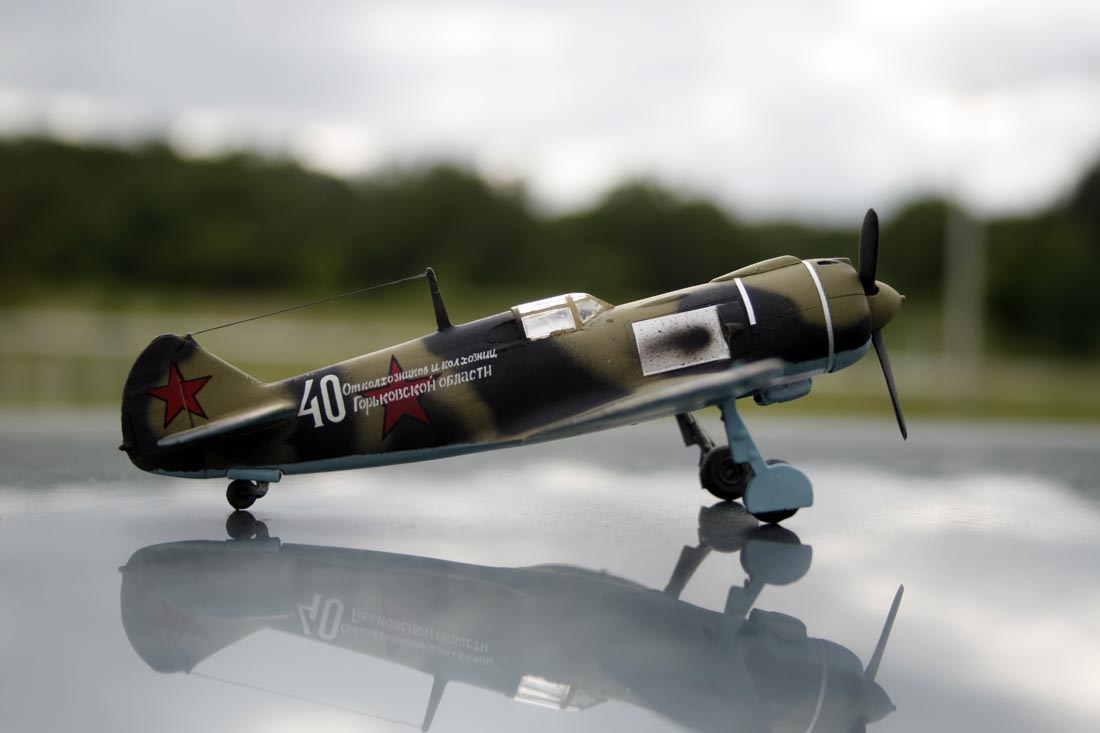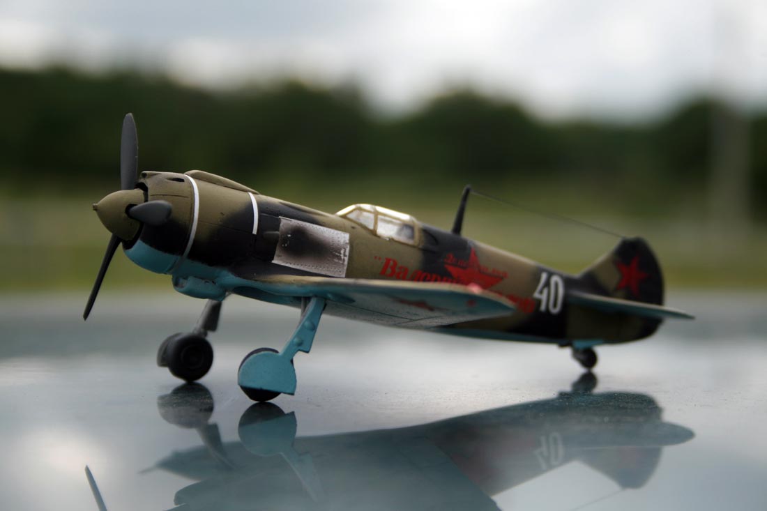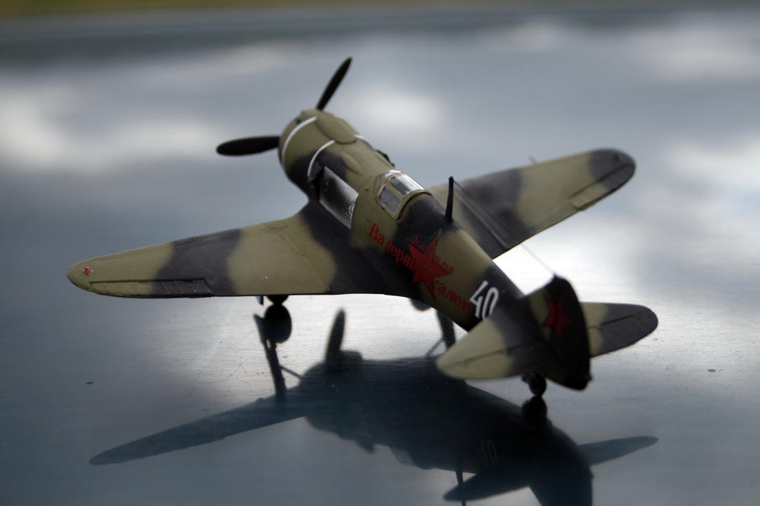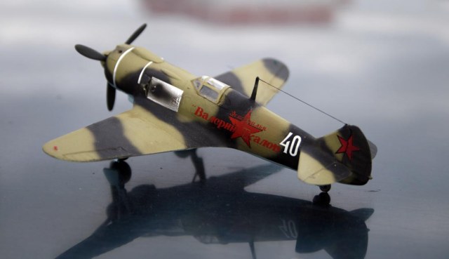 Модель собиралась давно, даже не помню когда. Производителя не помню. Черный такой, угрюмый пластик. На борту были нанесены надписи Валерий Чекалов от Ил-2. Копаясь в закромах отрыл обрезки декали на Ла-5 от Траверс. Сегодня до обеда шёл дождь и удалось посидеть с моделью. Содрал старые надписи, подкрасил поверженную краску. Нанес декали. Задул полуматовым лаком. Установил потерянное ПВД. Огни БАНО, натянул тросик антенны. Зеленый конечно не тот, но перекрашивать не стал, нет запаса звезд с чёрным кантом.