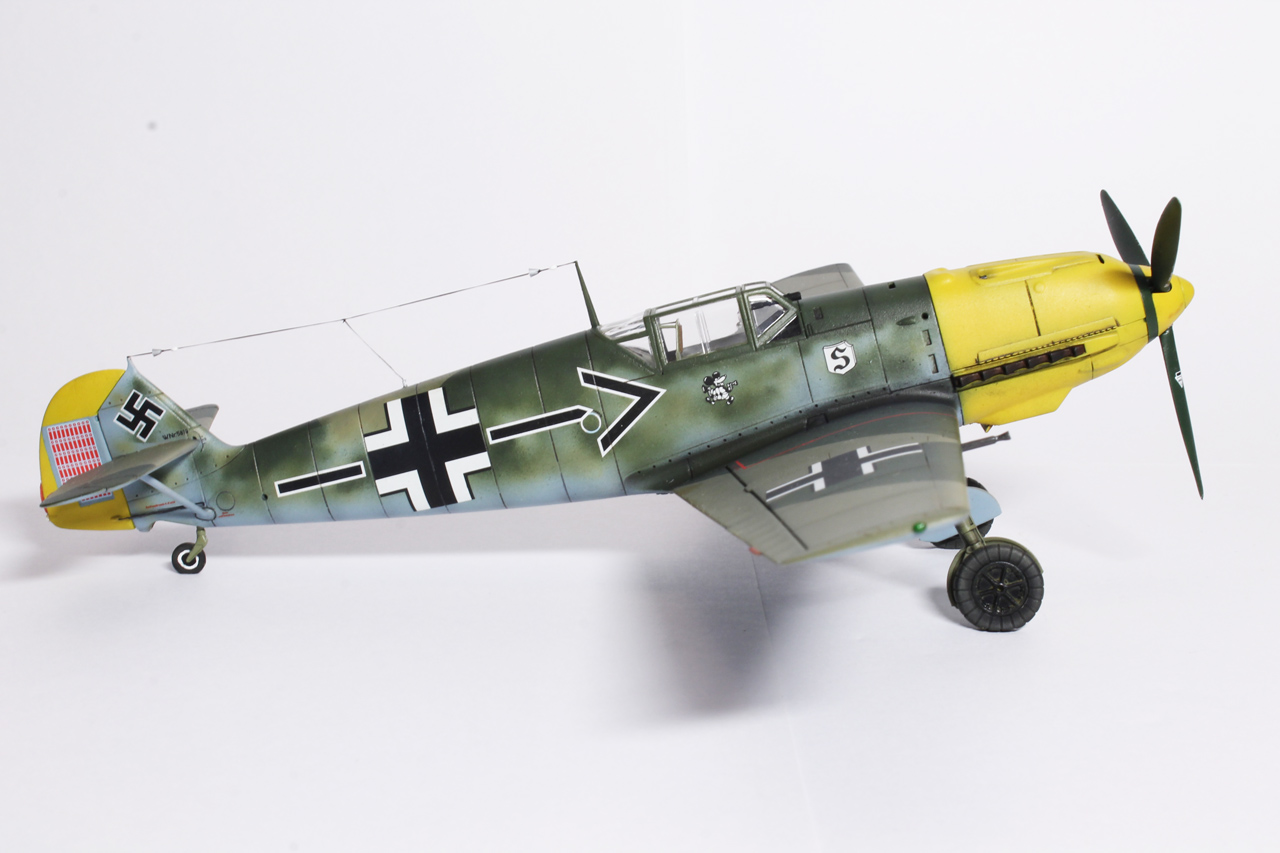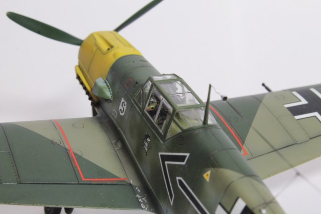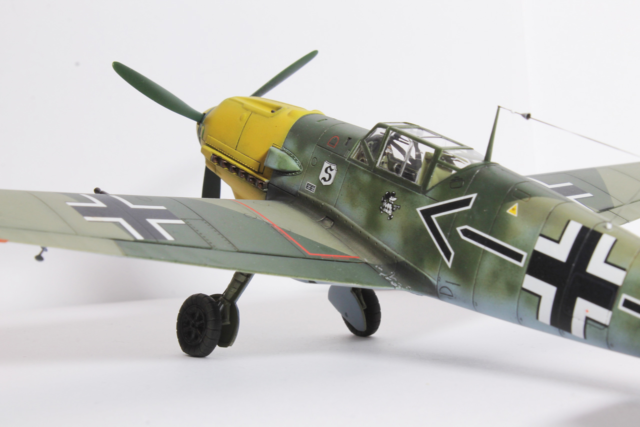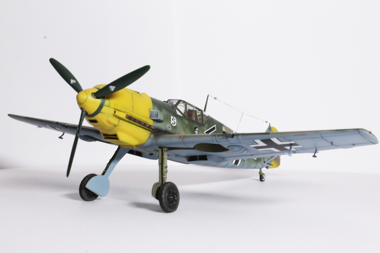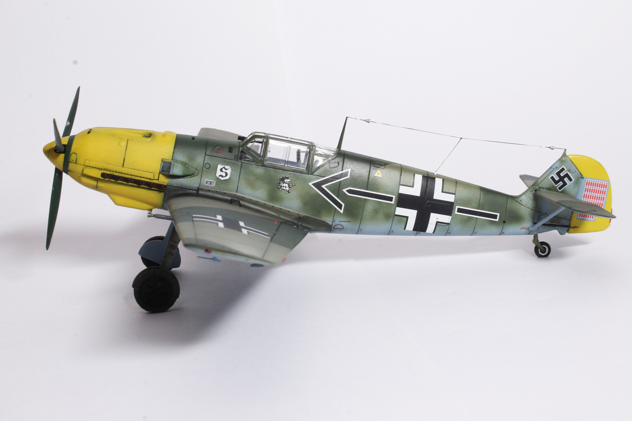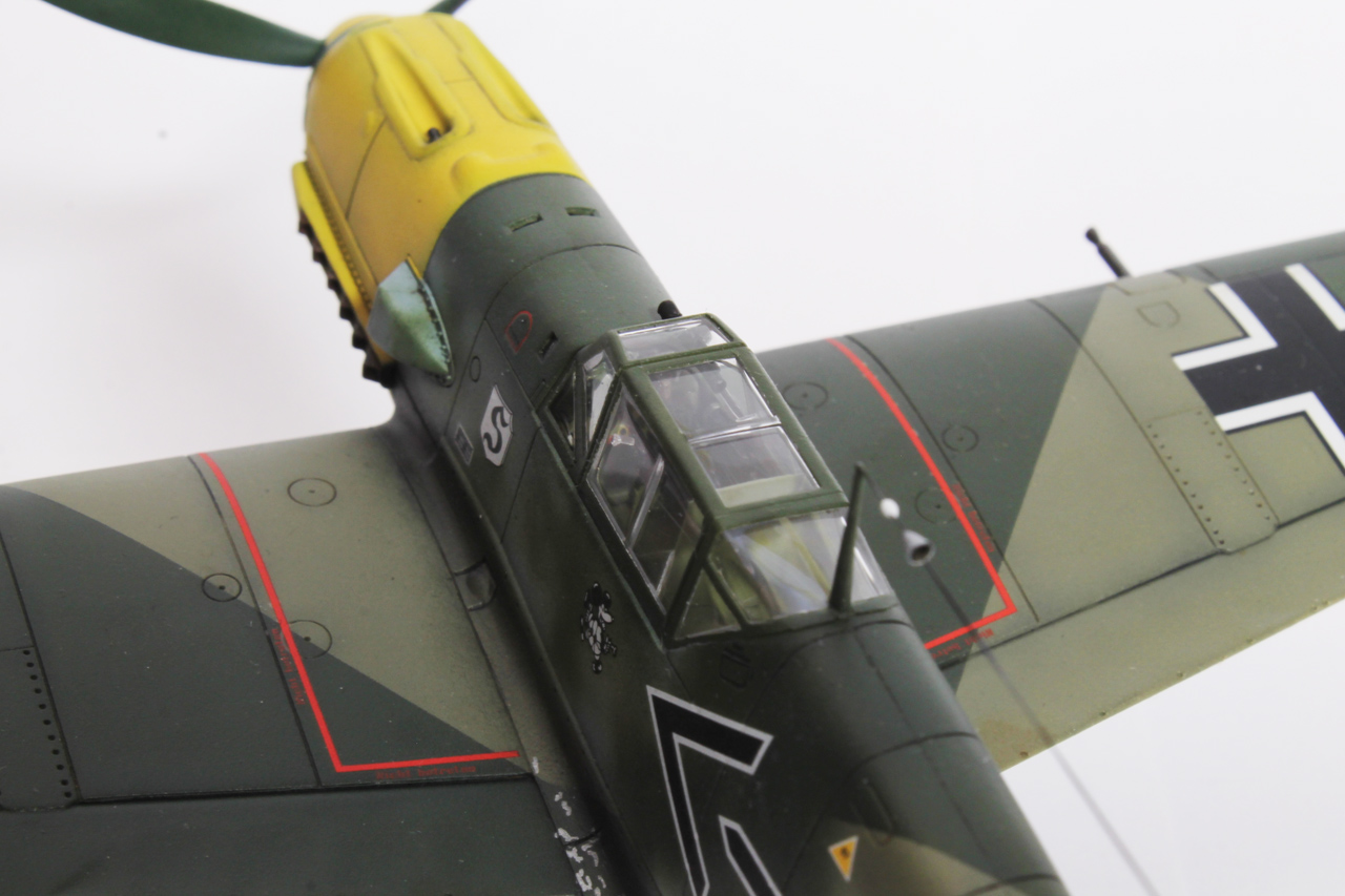 Здравия.Представляю ещё одного худого,на этот раз в 48-м масштабе.Набор тоже довольно известен,неплох по качеству,отлично собирается.Из недостатков грубоватая мелочёвка,очень,даже не так ,ООЧЕНЬ толстое остекление.Добавил только ремни в кабину,чуть доработал приборку(хотя толком всё равно ничего не видно из-за толстого фонаря,рассверлил стволы вооружения,выхлопные патрубки,прорезал кое какие отверстия,сделал шланги гидравлики на стойки,антенна нить Хобби+.Красил как всегда эмалями Акан,с окраской Галландовского 5819 в конец запутался,он в разное время нёс и разную окраску и разную маркировку ,победные марки на РН по разному были нанесены,был и с подвесным баком и с установленной системой GM1.Решил красить по инструкции от Эдуардовского Е-4,всё таки давно хотел построить эту легендарную машину.Расшивку выделял маслянной краской на бензине для зажигалок,чуть попачкал маслом и тамиевскими пудренницами.Финишное покрытие матовый лак Microscale/