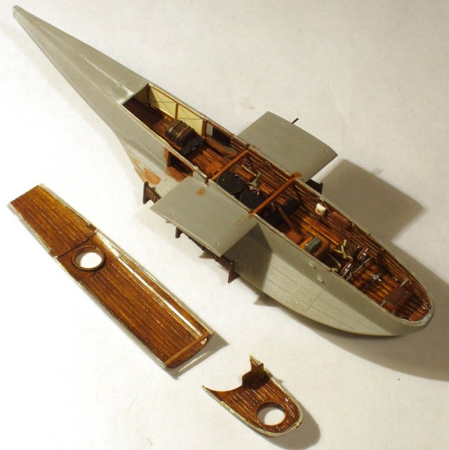 Затем -красная краска (акрил, Тамия), потом: лак, днище «под дерево», смывка, "грязь" на "проходных" местах, лак.