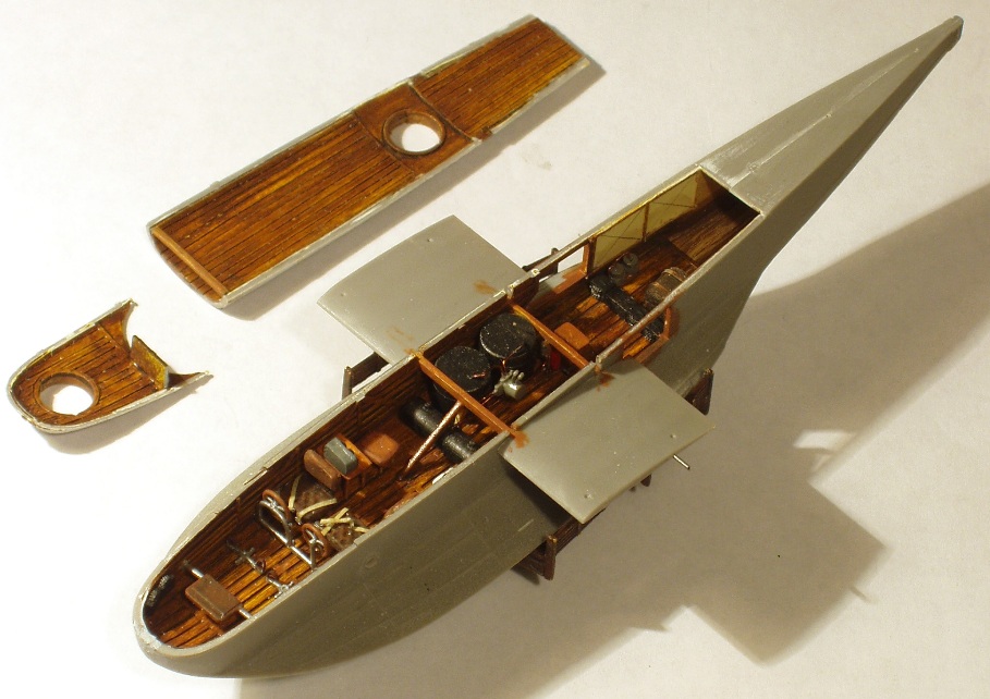 Внутренние стенки фюзеляжа, верх и днище производитель даёт идеально гладко. "Вооружившись" доширопластиком, выполнил внутренний каркас фюзеляжа и кельсоны, начал выполнение кабины более подробно и, надеюсь, более точно.Так же выполнил имитацию каркаса ТРАНСПОРТНОЙ ТЕЛЕЖКИ. Тележку закончил, но сделал её темнее, со смывкой(гуашь +фейри), металл-Тамия, окончательно- лак. После лака (см. мой предыдущий пост)- смывка, так же без изысков: гуашь + фейри.