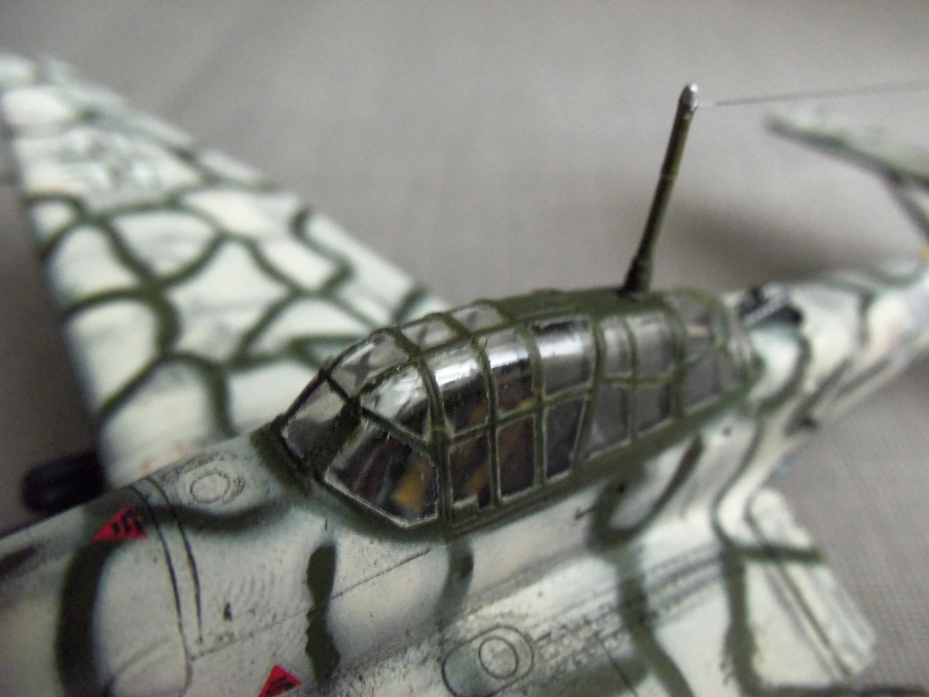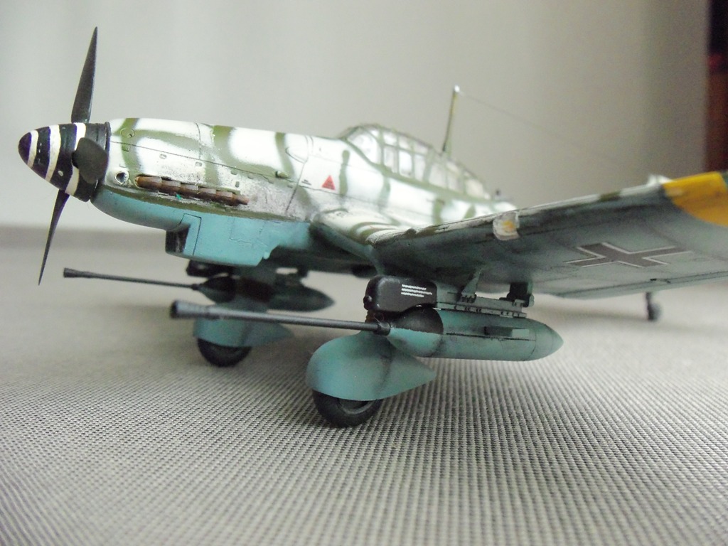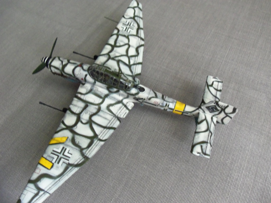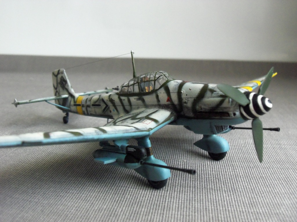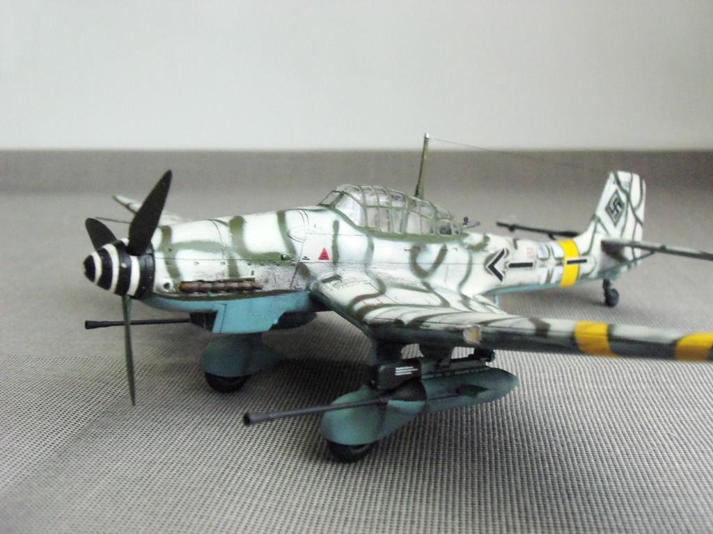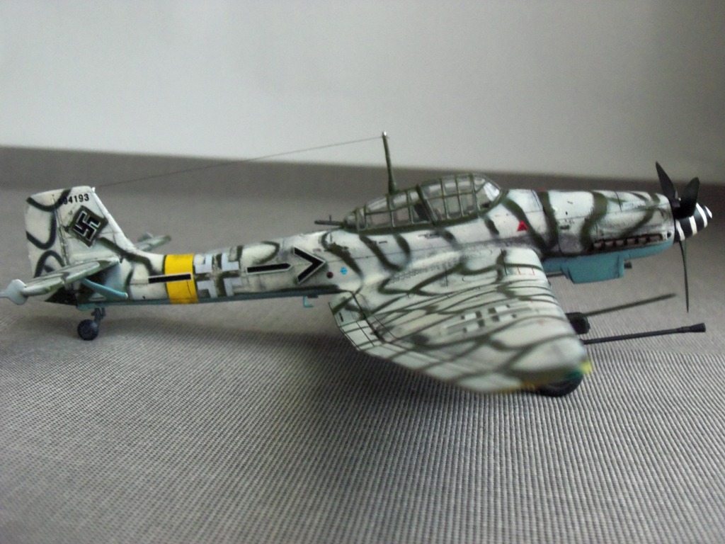 Всем приятного время суток. Хочу показать очередную свою модель Ju- 87G немецкого аса Ханса Руделя. Модель решил сделать в зимнем варианте т.к. на форуме летний вариант уже широко представлен. Модель мне понравилась по сборке,а вот деталировка скудная. Из доработок: наполнил как мог кабину,добавил кресло стрелка, повесил ремни из фольги, доработал пулемёт,натянул антену из чулка,огни сделал жидким канц. клеем.Красил авто эмалями,потом глянц. лак и нанёс деки ,дальше смывка гуашь+ферри и опять лак, в конце задул всё мотовым лаком от АКАН. Жду оценок.