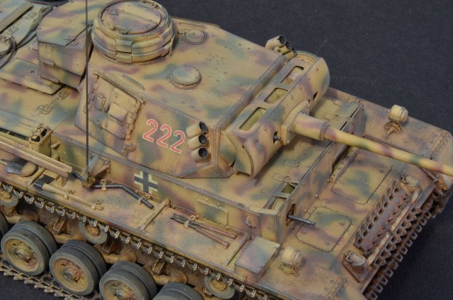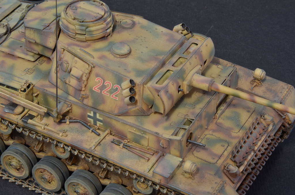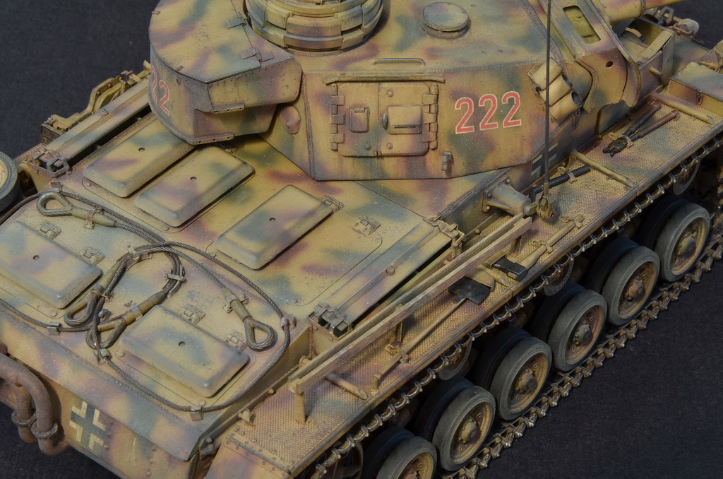 Покраска тамийским акрилом, смывка и эффекты – жидкости АК, пигменты – Мастер пигмент. Сильно ушатывать и грязнить не стал, только чуть запылил. Камуфляж и ОЗ выбрал с привязкой к 23 панцер-дивизиону 1943г. Во время фотосессии в саду произошел незапланированный налет штурмовика в виде бешеного воробья, который задел антенну, и она сложилась четко в короб. Так что доработка в виде подвижной антенны себя оправдала.)))