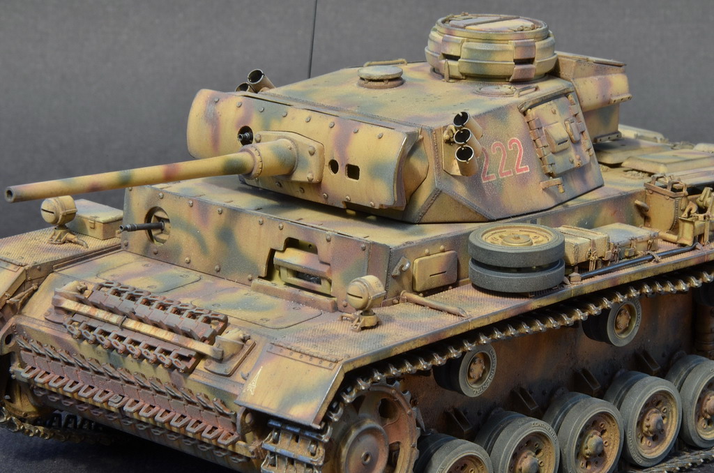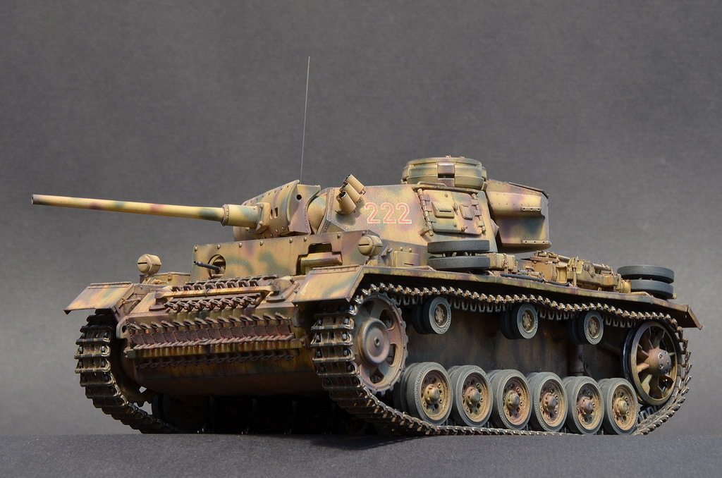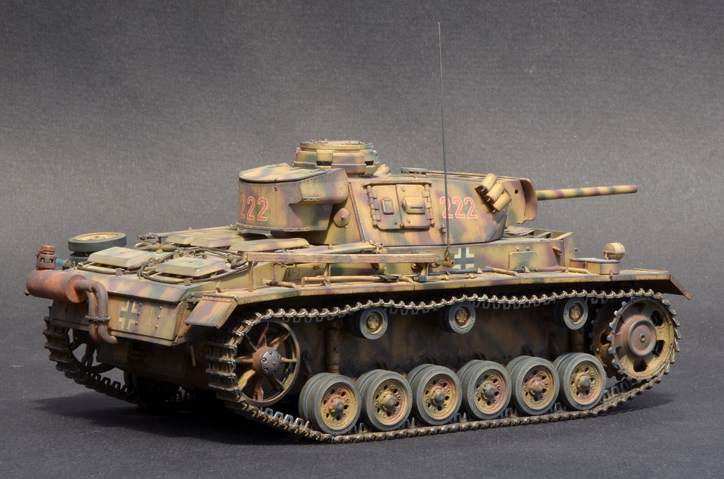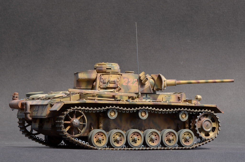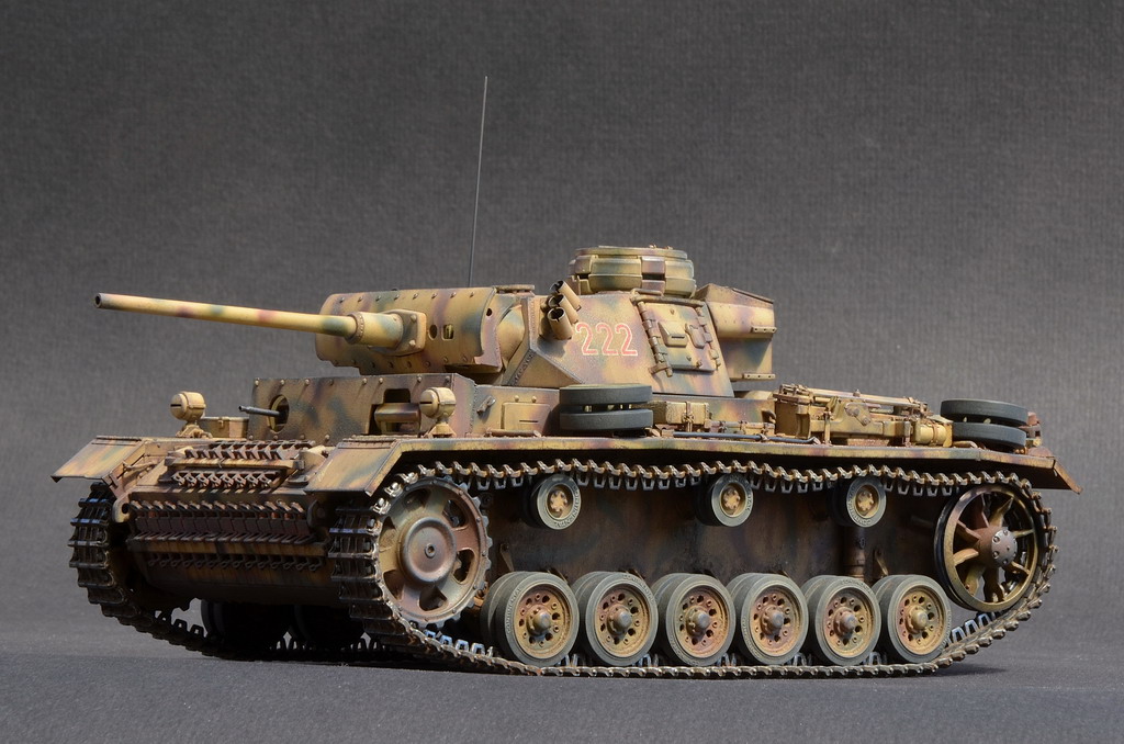 Разрешите представить модель Pz.Kpfw.IIIAusf.M. Выбор модификации был обусловлен тем, что из всего семейства трояков, этот нравится мне больше всех, т.к. за счет длинного орудия и удлиненной кормовой части смотрится более приземисто, стремительно и дерзко, чем его ранние сородичи, ну и всякие примочки для преодоления бродов выгодно дополняют эстетический облик машины.