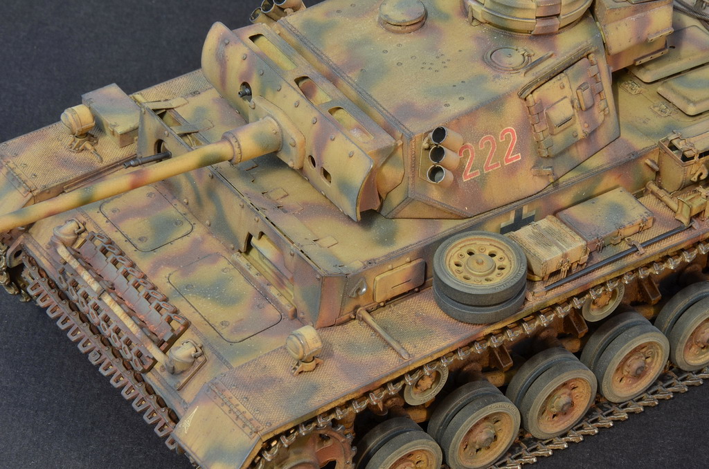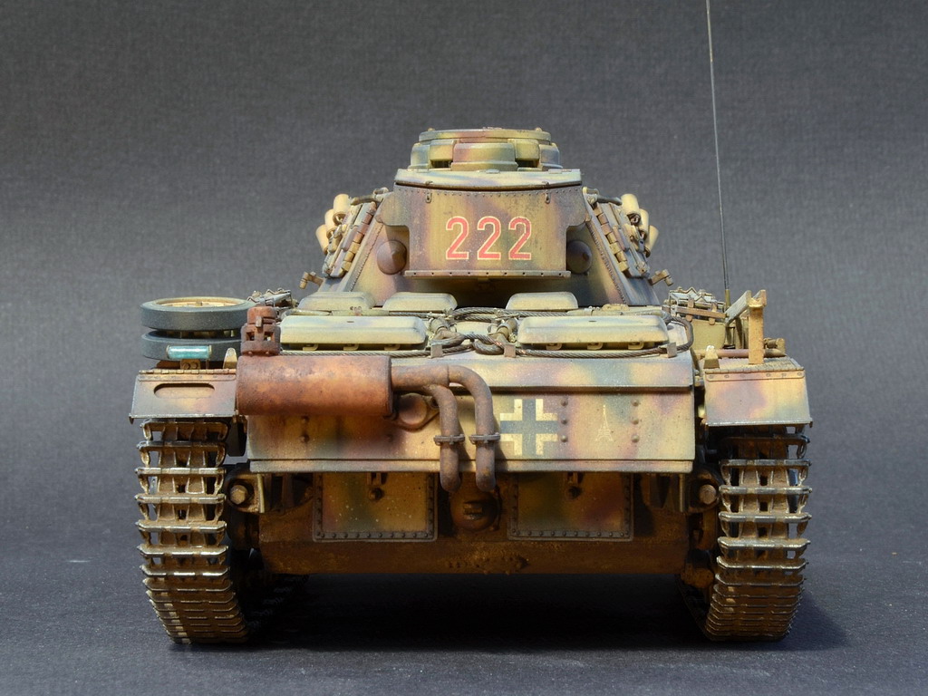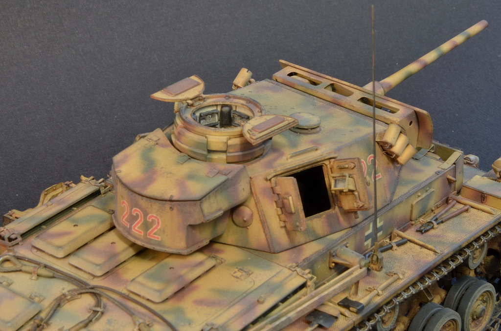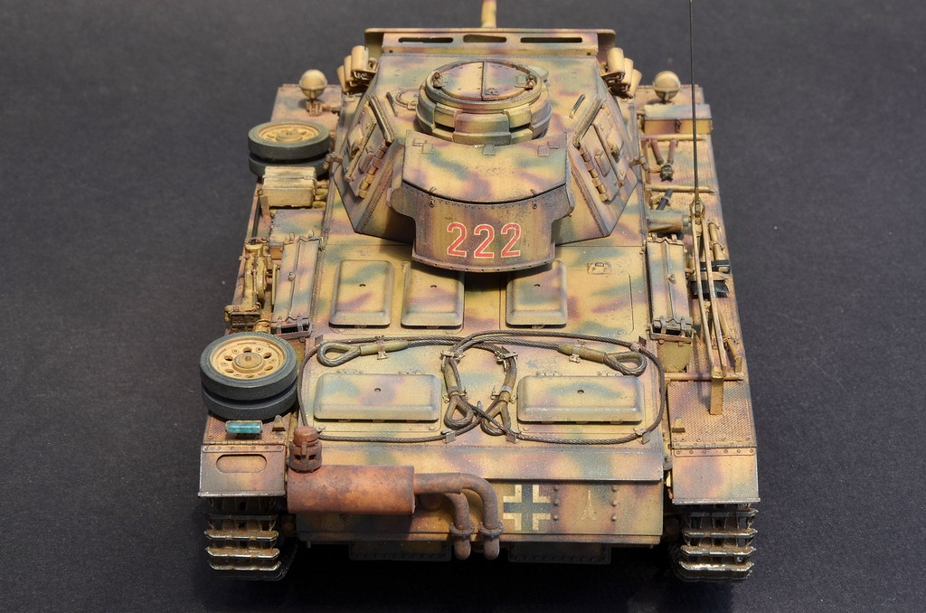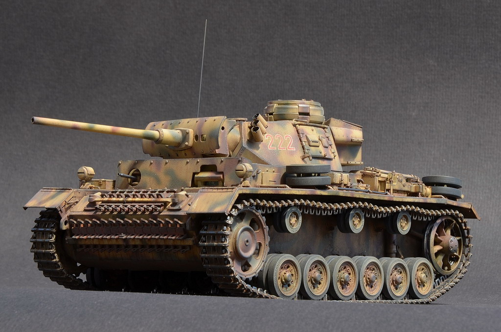 Разрешите представить модель Pz.Kpfw.IIIAusf.M. Выбор модификации был обусловлен тем, что из всего семейства трояков, этот нравится мне больше всех, т.к. за счет длинного орудия и удлиненной кормовой части смотрится более приземисто, стремительно и дерзко, чем его ранние сородичи, ну и всякие примочки для преодоления бродов выгодно дополняют эстетический облик машины.