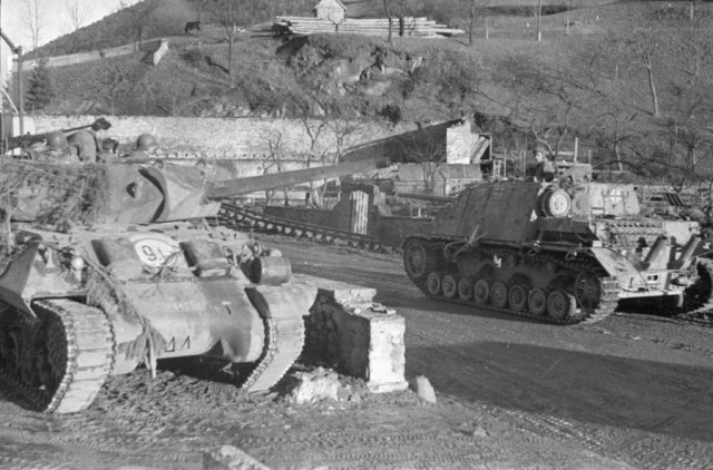 Представляю вам диораму, воссозданную по фронтовым снимкам. Действие происходило во Франции, предположительно декабрь 1944-го - январь 1945-го. Американские танкисты транспортируют своим ходом подбитый в ходе Арденнской операции немецкий самоход в город Сомюр, где через некоторое время он станет экспонатом местного военного музея.