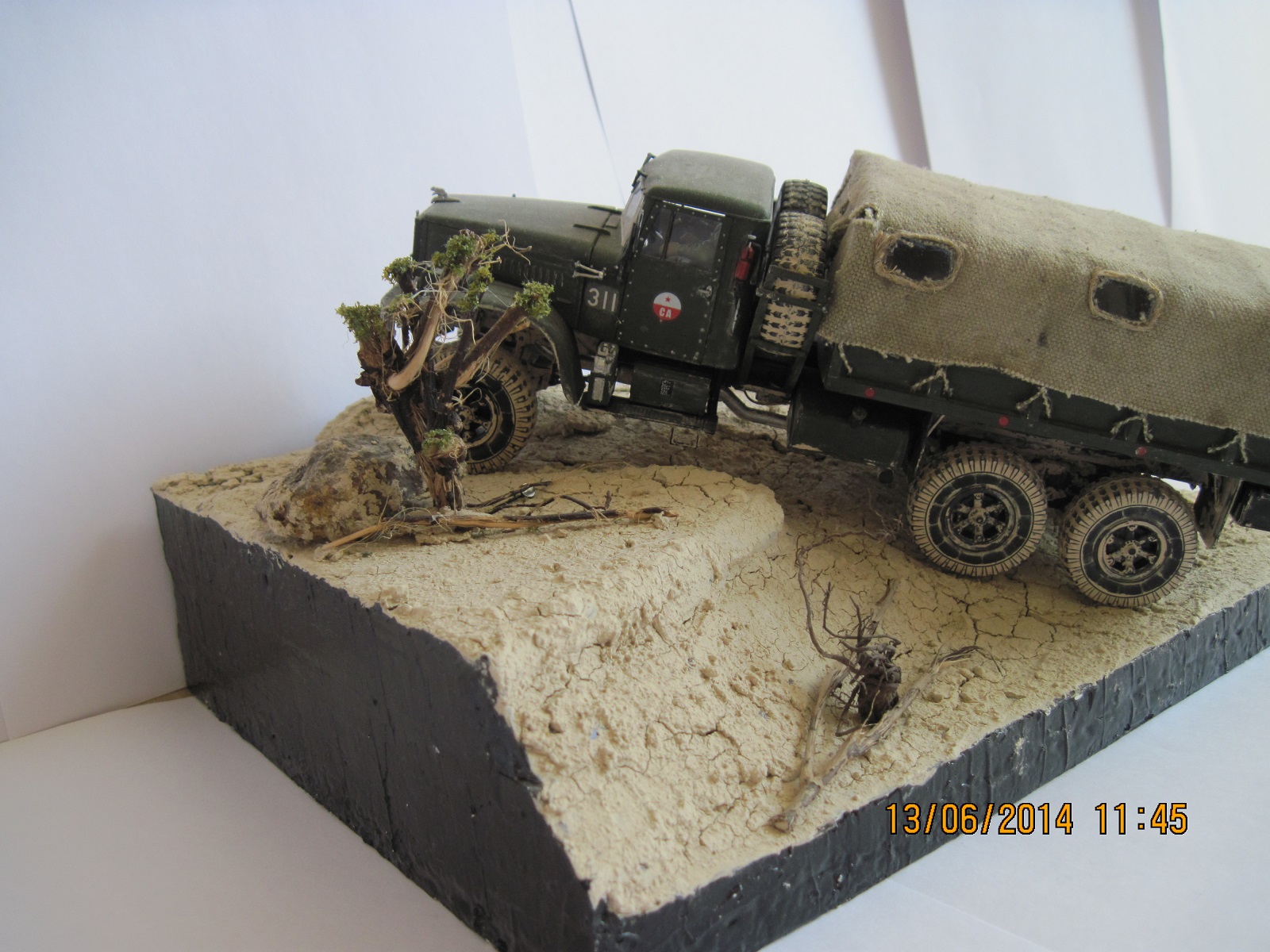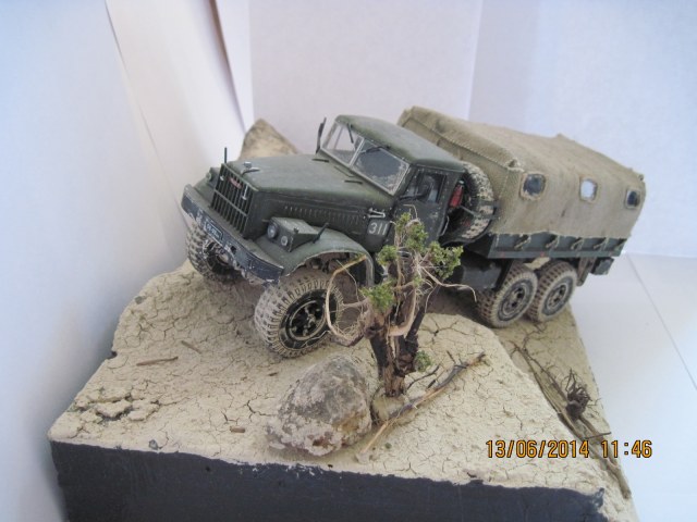 Краз 214 с фарами и зеркалами от краз 255 едет по пустыни. Краски использовал тамиевские и звездовские, сама диорама сделана из пенопласта и кошачей засыпки, для разнообразия прикреплены камни и травка из коры. после коментариев решил надеть тент и прикрепить канат, запылил пигментами краску и загрязнил резину, спилив швы. по поводу несоответствия матчасти...... ну несоответствует мне так больше нравится)))))