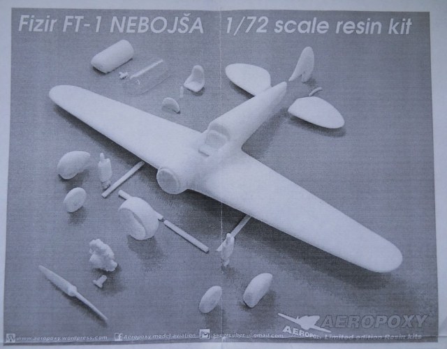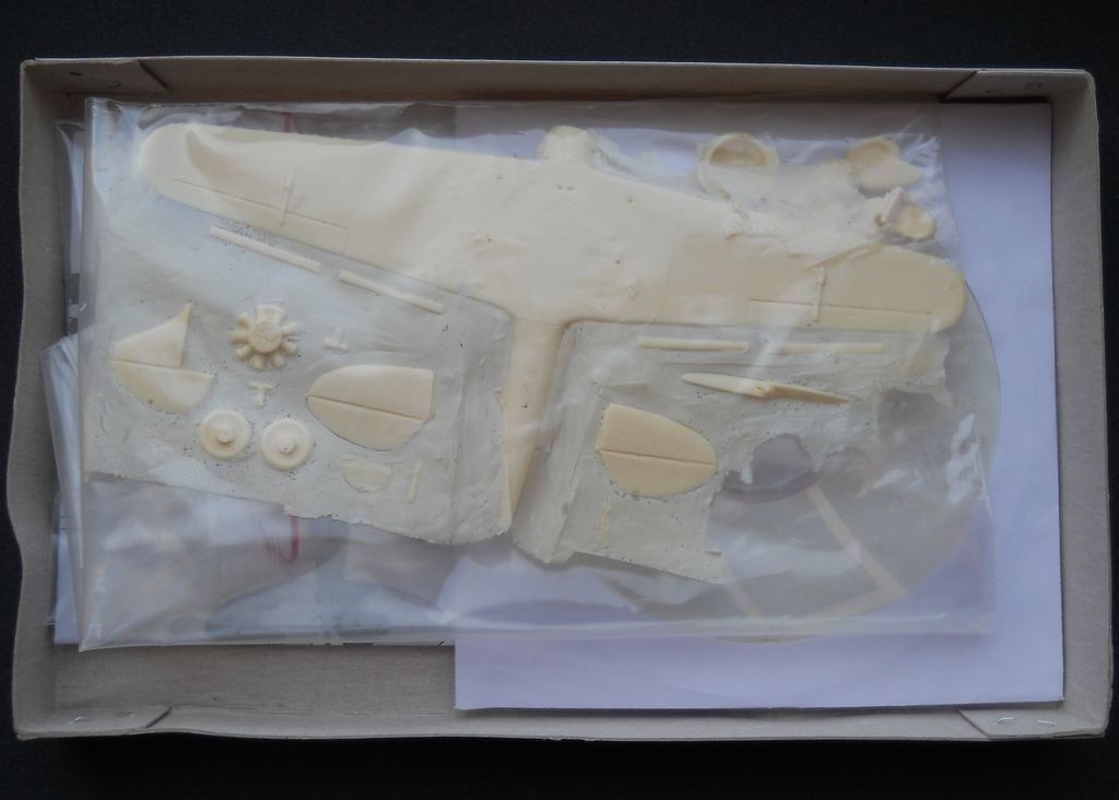Модель от фирмы AEROPOXY в масштабе 1/72 из смолы упакована в картонную коробку. Набор содержит смоляные детали, вакуумформованные фонари, декали, кусочек клеющейся фольги , инструкцию и CD диск с исторической информацией о самолёте. Качество литья очень плохое. Всё дело в огромном количестве мелких пузырей, они буквально всюду. Интересное членение модели: фюзеляж с крылом и большая часть интерьера кабины отлиты одной деталью. Грубовато выполнены отдельные детали «мелочёвки». Декали (на самолёт захваченный немцами) выглядят нормально. Ваку-фонари прозрачны, но без чётко выраженных границ – придётся потрудиться при подгонке. Инструкция содержит схему окраски и некое руководство по сборке в виде фото.