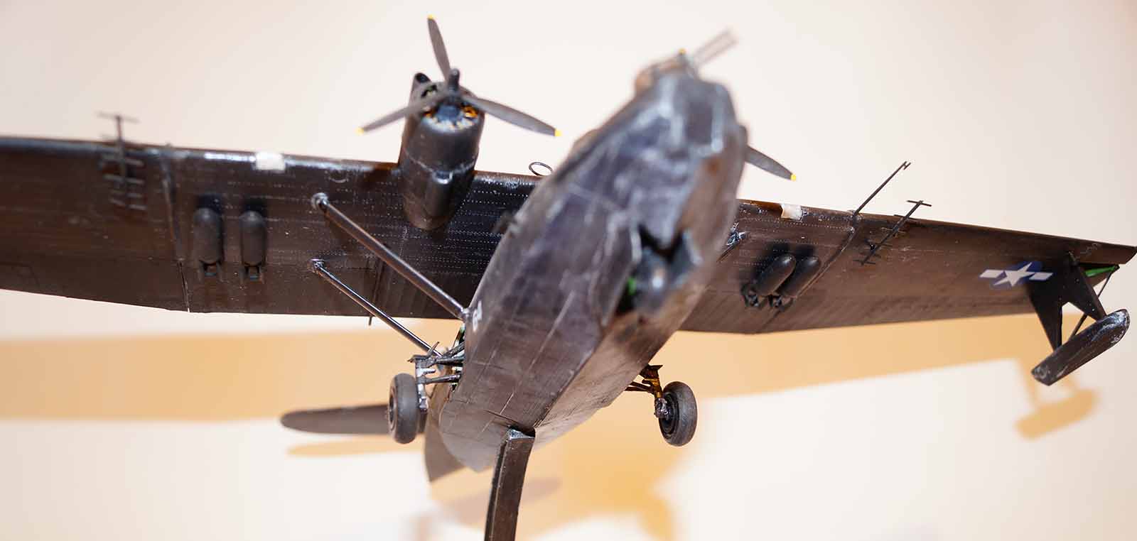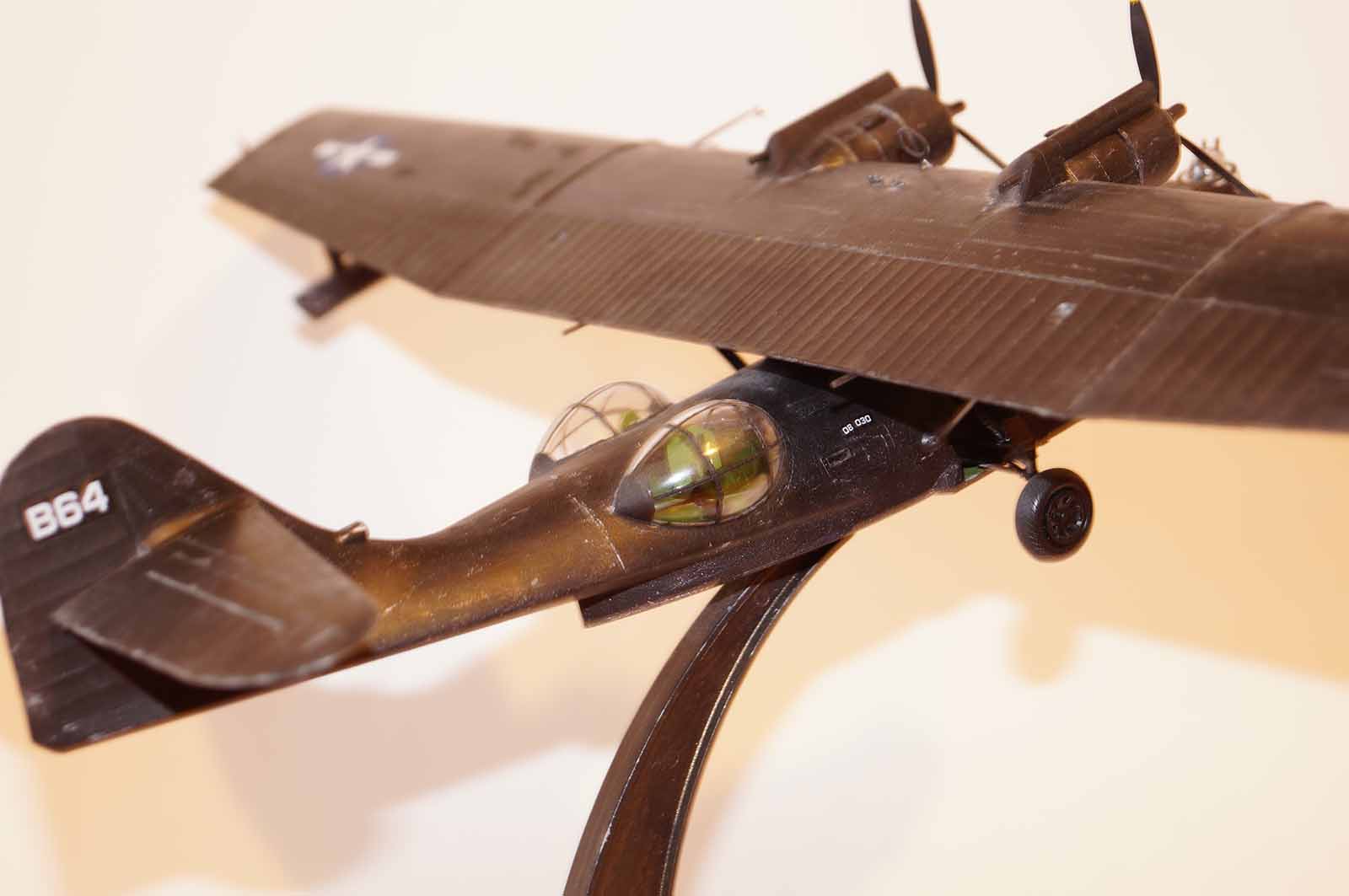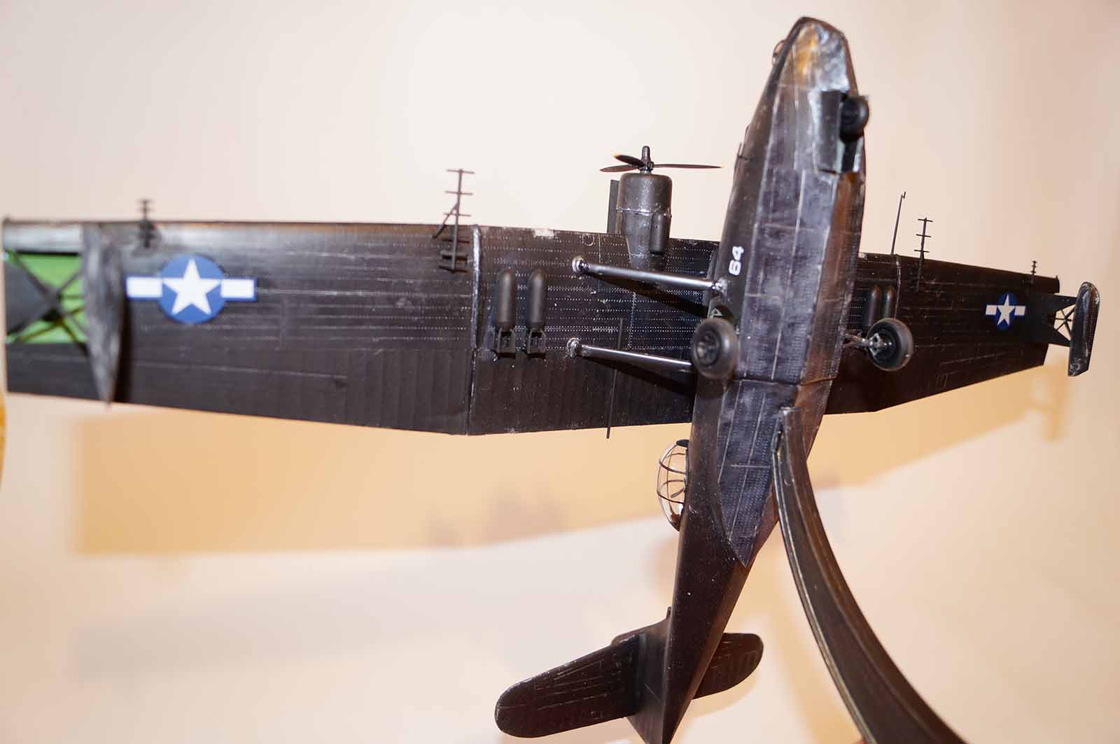 Долго не решался на постройку самолета . Несколько пугала сложность сборки. Но , что называется , глаза боятся , а лапы так и тянутся где нибудь напакостить . В результате появилось данное произведение искусства , затмевающее славу самого Микеланджело...Сам себя не похвалишь... Особое внимание уделил покраске самолета. Грунтовал алюминиевой краской. поверх грунта положил черную краску . Затем была попытка ( не совсем успешная, но и не самая отвратительная) произвести ,,обгадинг,,. Местами черная краска была счищена, имитируя потертости , царапины , сколы и прочее .