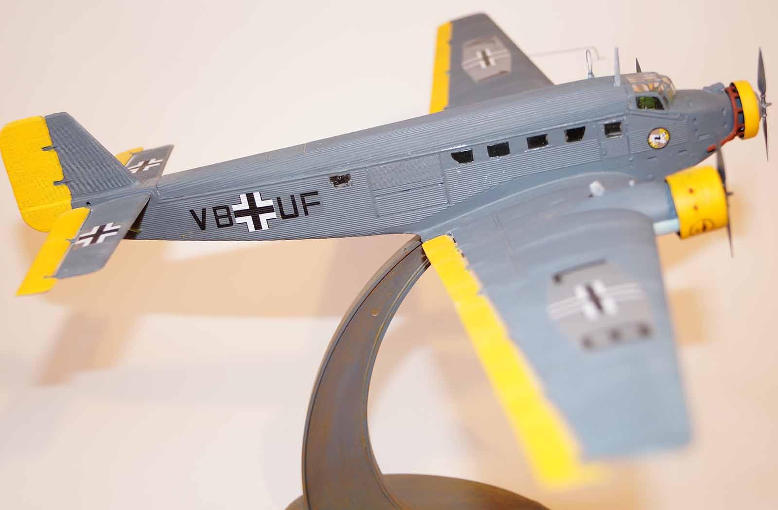 Крайне странную окраску, борт VB+UF принадлежал Blind Flugschulo B36 и имел модификацию Ju.52/3mg6e. Те, несоответствие по остеклению и отсутствие верхней стрелковой точки наталкивает на мысль что это не "оно"