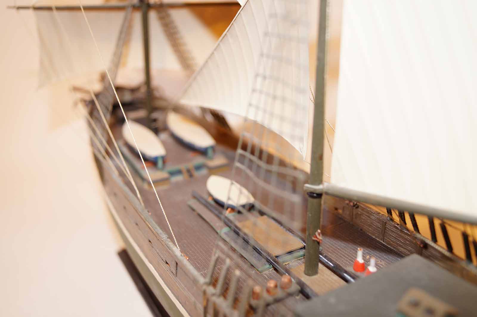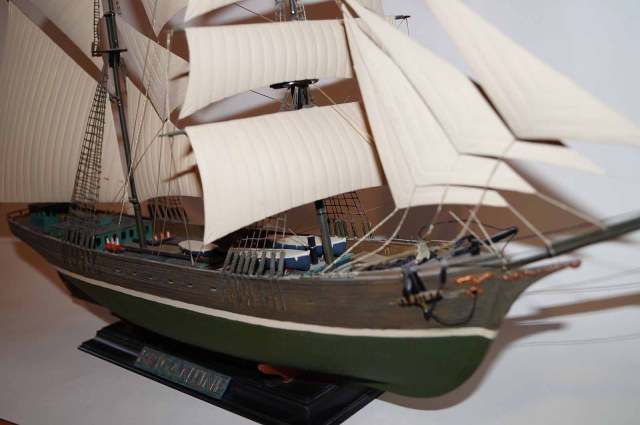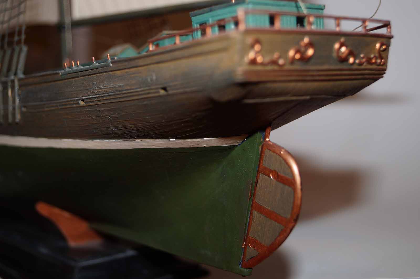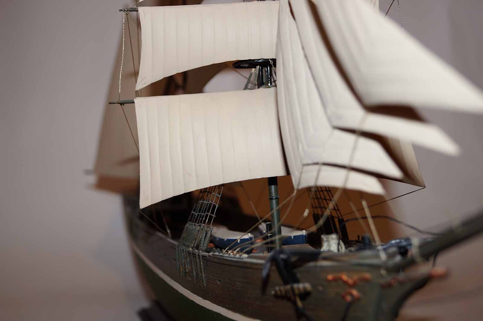 Очень понравилась окраска корпуса, надстроек полное ощущение старого дерева, судна прошедшего все моря и океаны. Не удались ванты и такелаж. Нет обвязки шлюпок.