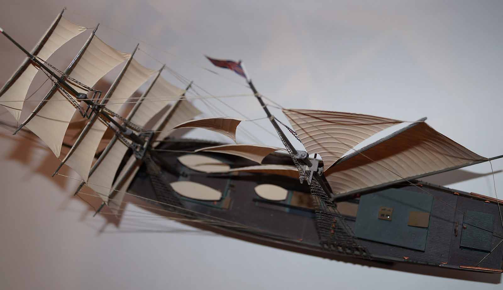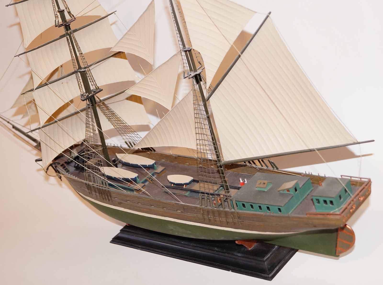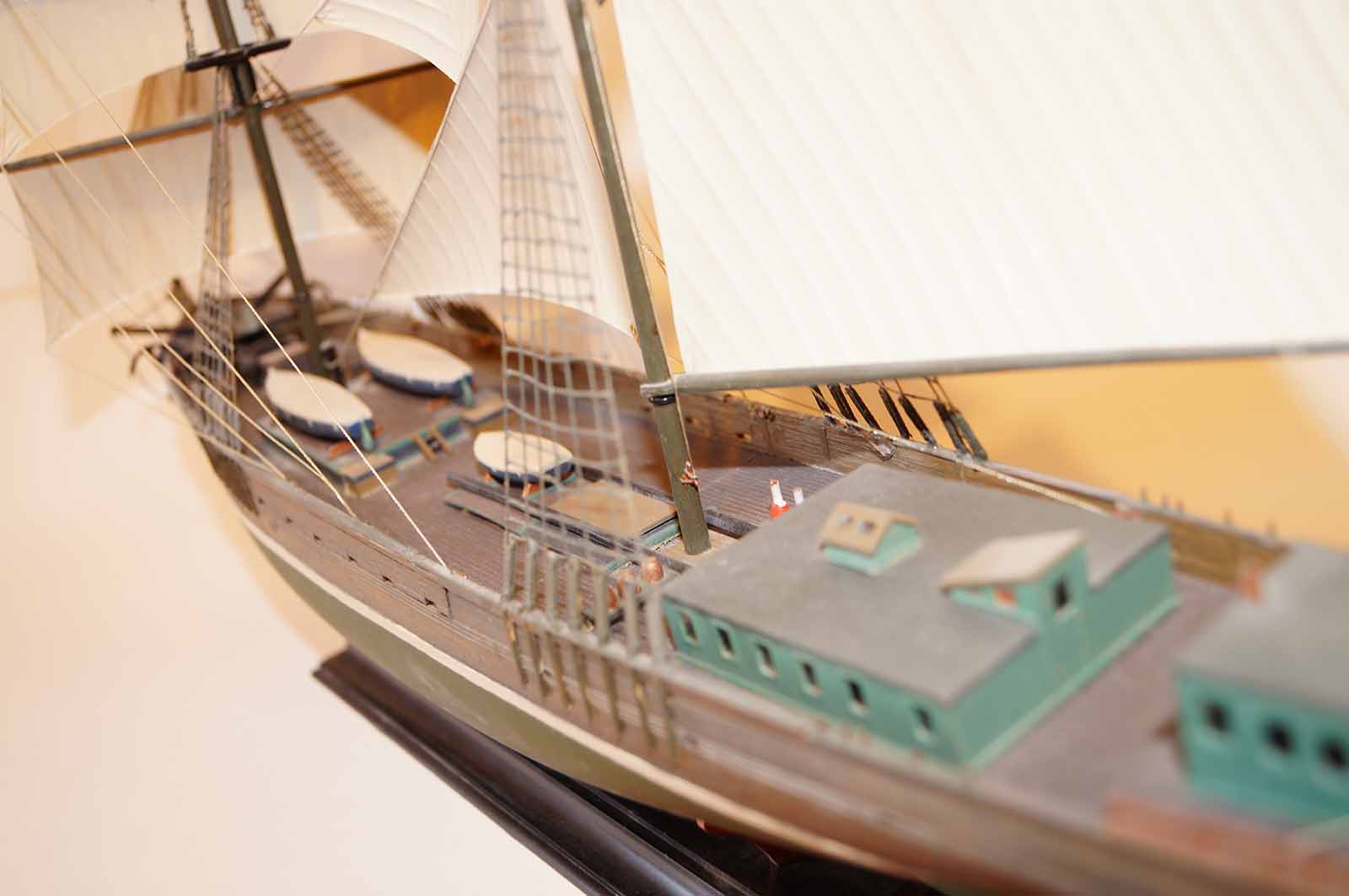 Очень понравилась окраска корпуса, надстроек полное ощущение старого дерева, судна прошедшего все моря и океаны. Не удались ванты и такелаж. Нет обвязки шлюпок.