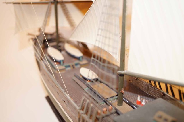 Здравствуйте. А расположение малой шлюпки вы сами придумали или в схеме так было? Сам сейчас собираю такую. Паруса окрашивали? Если да то скажите как, очень понравился их цвет. А вот перо руля установлено не верно у вас, набор не правильно предлагает его установить, его надо было развернуть. Может набор не от Звезды, а от Heller? В целом получилось не плохо. Не хотите показать модель в прихожей?