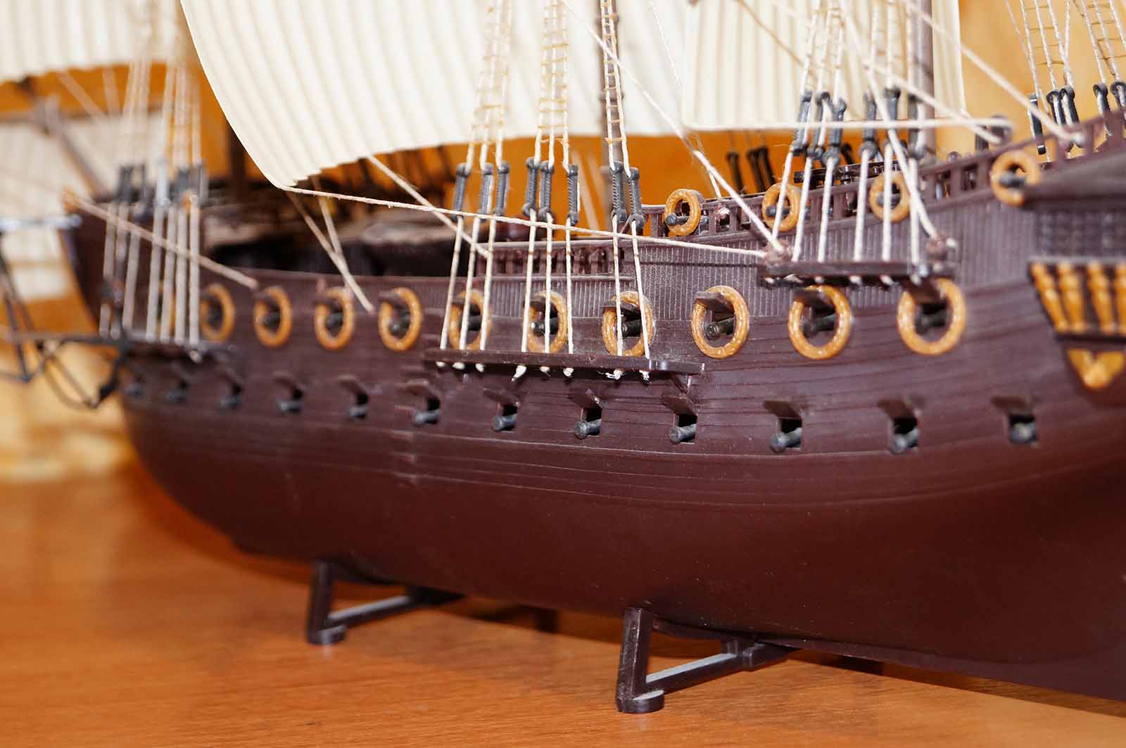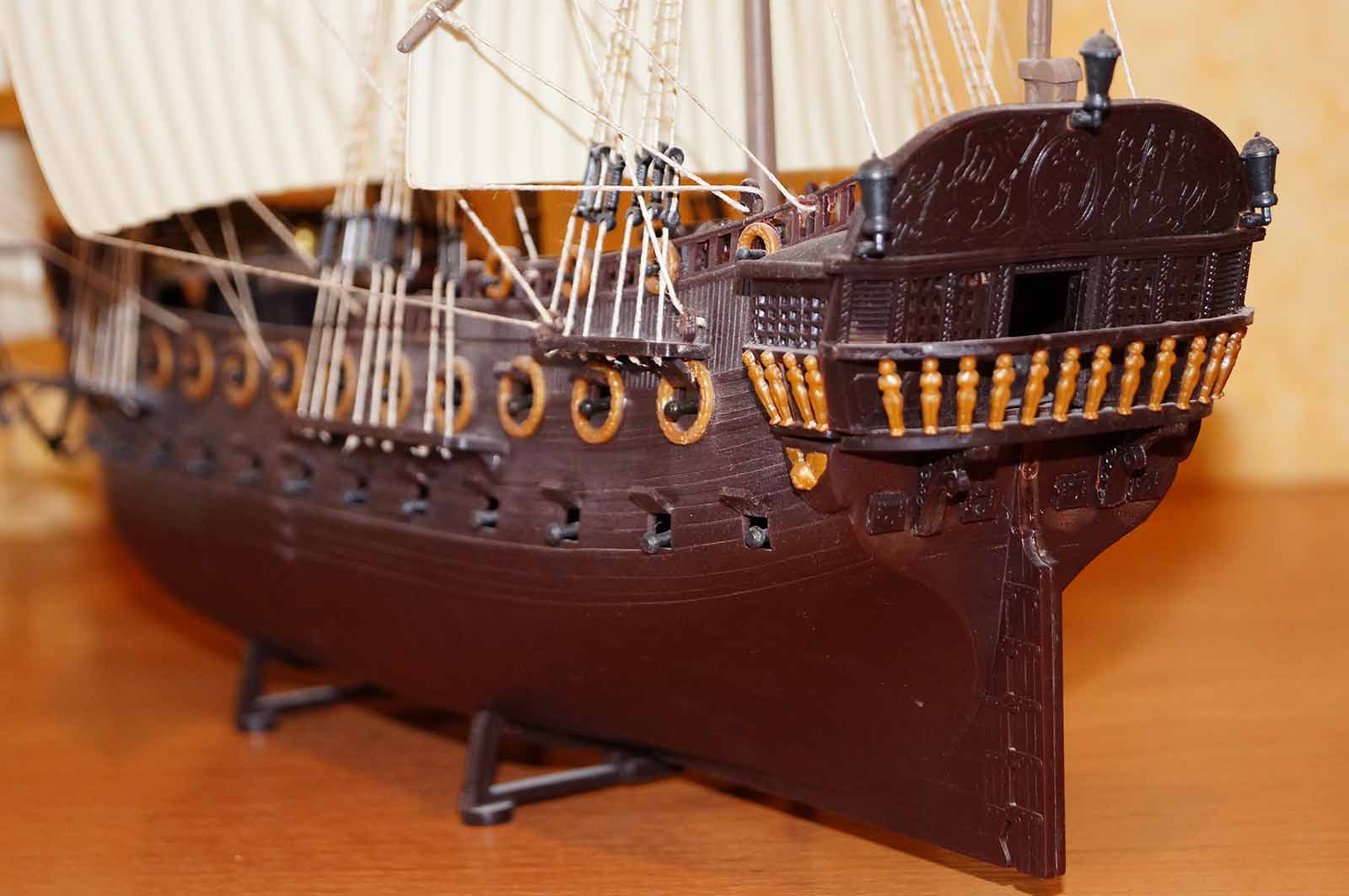 Сия модель никоим образом не претендует на восторженные эпитеты уважаемого сообщества . Скорее наоборот. Модель эта первая. Построена...Нет , скорее собрана на коленках , лет 15 назад . Это были , образно говоря , первые шаги . Поскольку никакого опыта тогда не имел , и не у кого было спросить ( интернет отсутствовал ) , то в покраске ограничился только палубой и мачтами, ибо литники были пронзительно желтого цвета , и резко контрастировали с остальными деталями .
